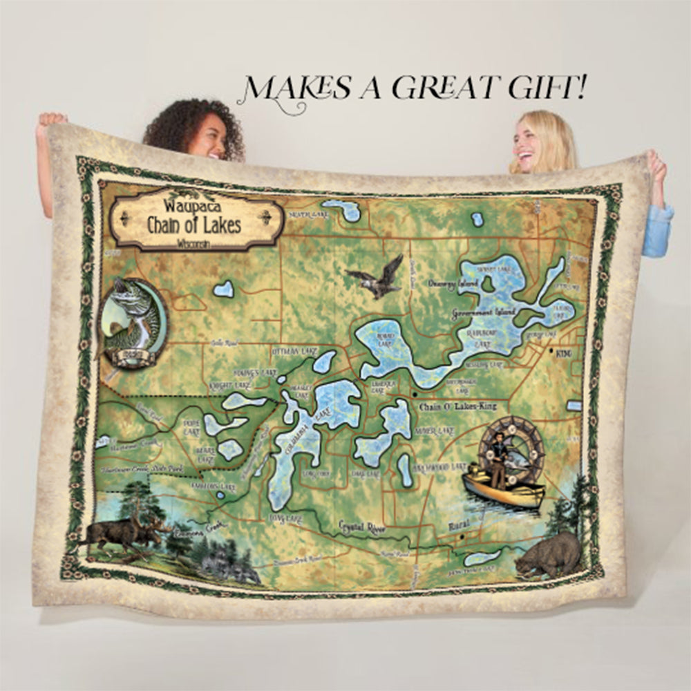 Chain O' Lakes Waupaca Wisconsin Map - Sherpa blanket, silky fleece blanket and polar fleece blankets perfect for Mom gifts, Dad gifts, children gifts, and travel gifts. Ideal lake house decor, cabin decor, tropical décor for guest blankets, living room blankets, and anywhere you want to add a beautiful map blanket of your favorite place.
