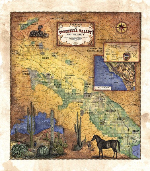 Coachella palm springs, old map california, palm springs art, palm springs art print, palm springs poster, california map art, map
