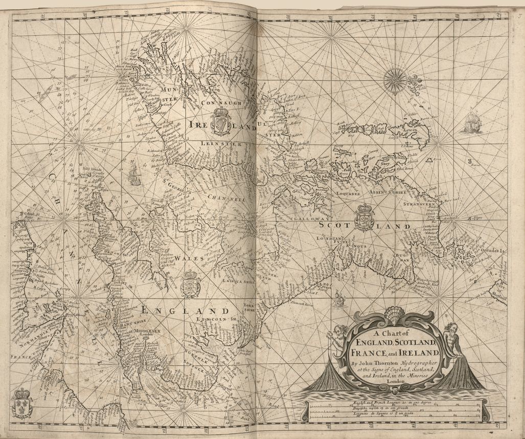 A Chart of England, Scotland, France, and Ireland is the shortened name of a portolan chart that goes by a couple of other names, including “Sea-atlas, Containing an Hydrographical Description of the Sea-coasts of Most of the Known Parts of the World.” It was published in 1700 in London by John Thornton, who was a hydrographer for the Hudson Bay Company and the English East India Company. However, he was more than that. He was a leading English chart maker