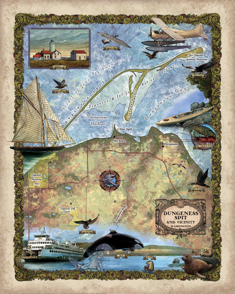 Stretching for roughly 6 miles east of Port Angeles and jutting into the Strait of Juan de Fuca, Dungeness Spit is the longest natural sand spit in the United States. This narrow strip of landform in northeastern Clallam County, Washington shelters the Dungeness Bay. Dungeness Spit is situated entirely within the Dungeness National Wildlife Refuge, which was established by President Woodrow Wilson on January 20, 1915, as a refuge, preserve, and rookery that protects the nutrient-rich tideflats for native and migrating birds during the spring and fall. Its eelgrass beds provide a nursery habitat for young salmon and steelhead, and the remote beach at the tip of Dungeness Spit supports harbor seals, providing a place to rest, birth and nurse their pups.
