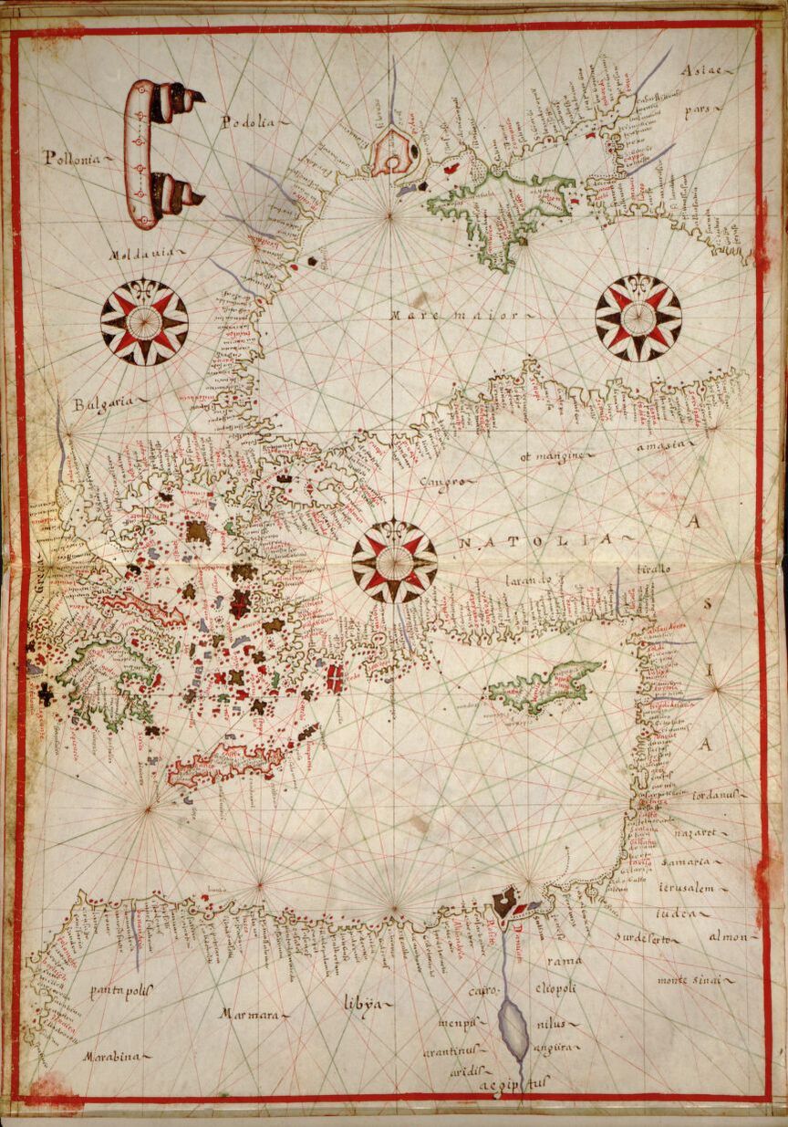 What do we know about Joan Oliva? He has his origin in a large family of prominent hydrographers that dominated portolan chart making in the western Mediterranean for more than a century. This is evident from signed portolan charts attributed to at least sixteen different members of the Oliva family recorded between the years 1538 and 1673. The Oliva name is associated with charts of the Mediterranean world, with some originating in places like Naples, Majorca, Palermo, Messina, Malta and Marseilles, among other regions. Joan was active in the cartographic world from 1580 to 1615 and was one of the most notable and highly regarded of the prolific Oliva family. His earliest charts are believed to have been created in Messina, Italy, but is cartographic works are scarce, with a few atlases in a private collection in Majorca, and another atlas in the British Library, United Kingdom. This rare portolan chart by Joan found in an atlas at the Library of Congress is an great illustration of his work.