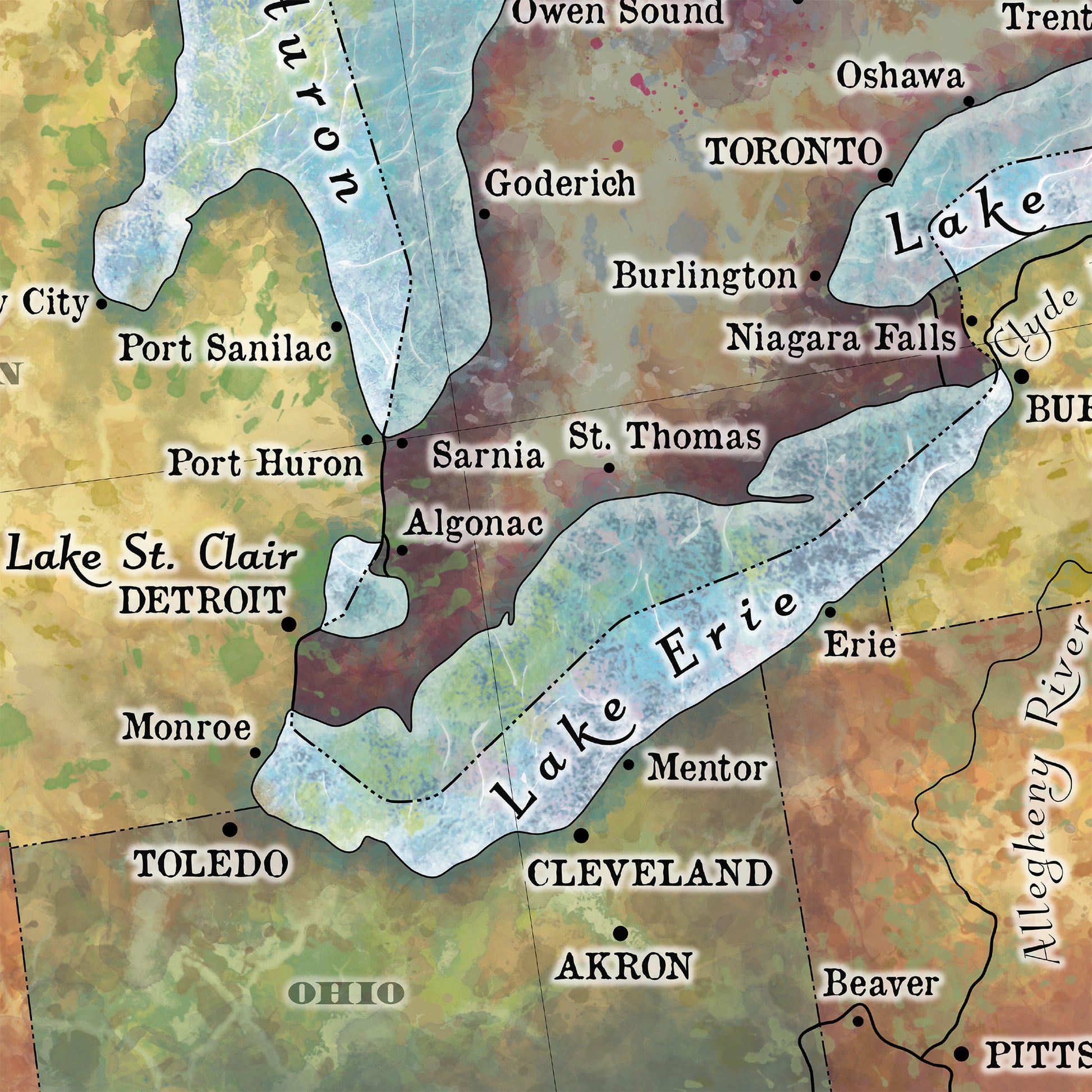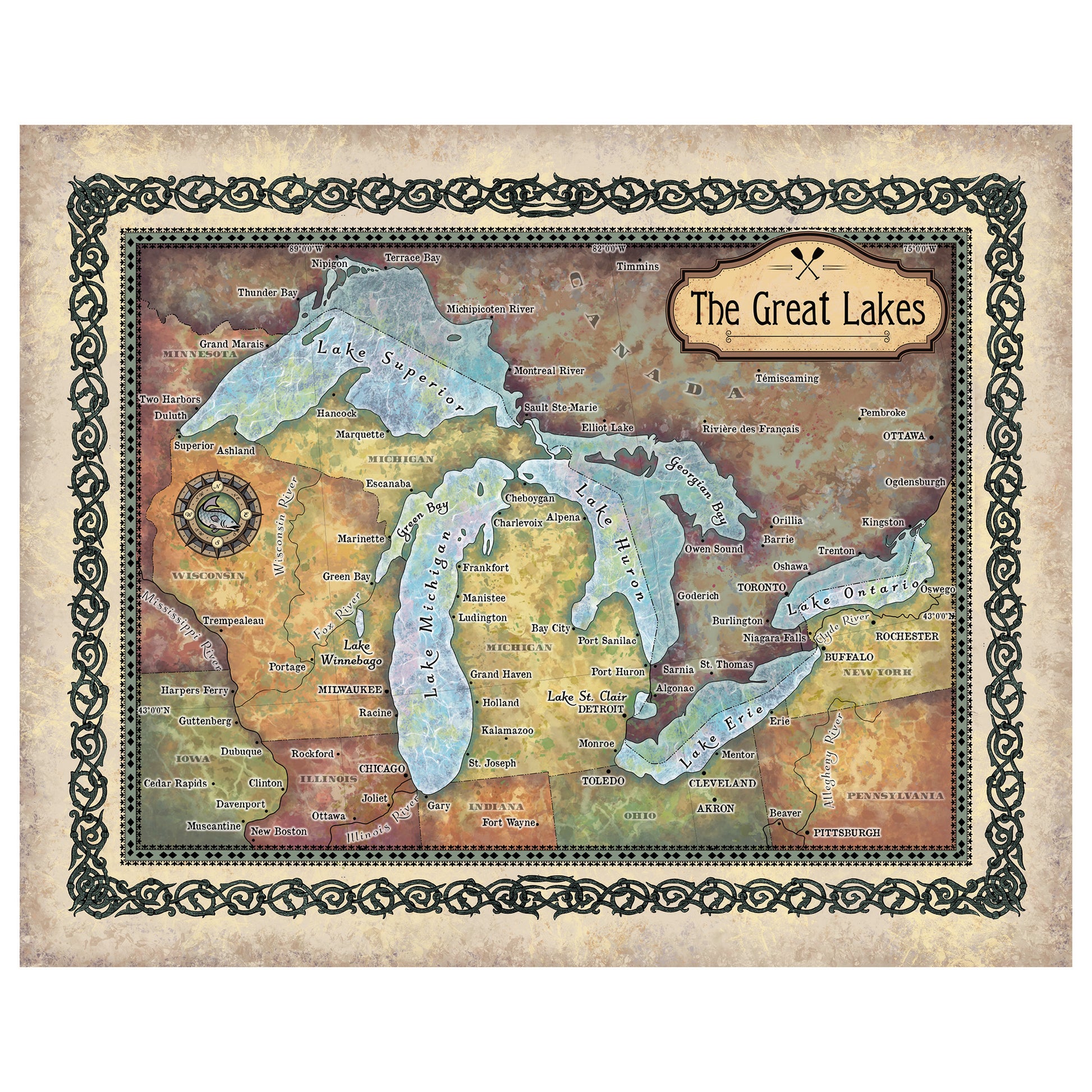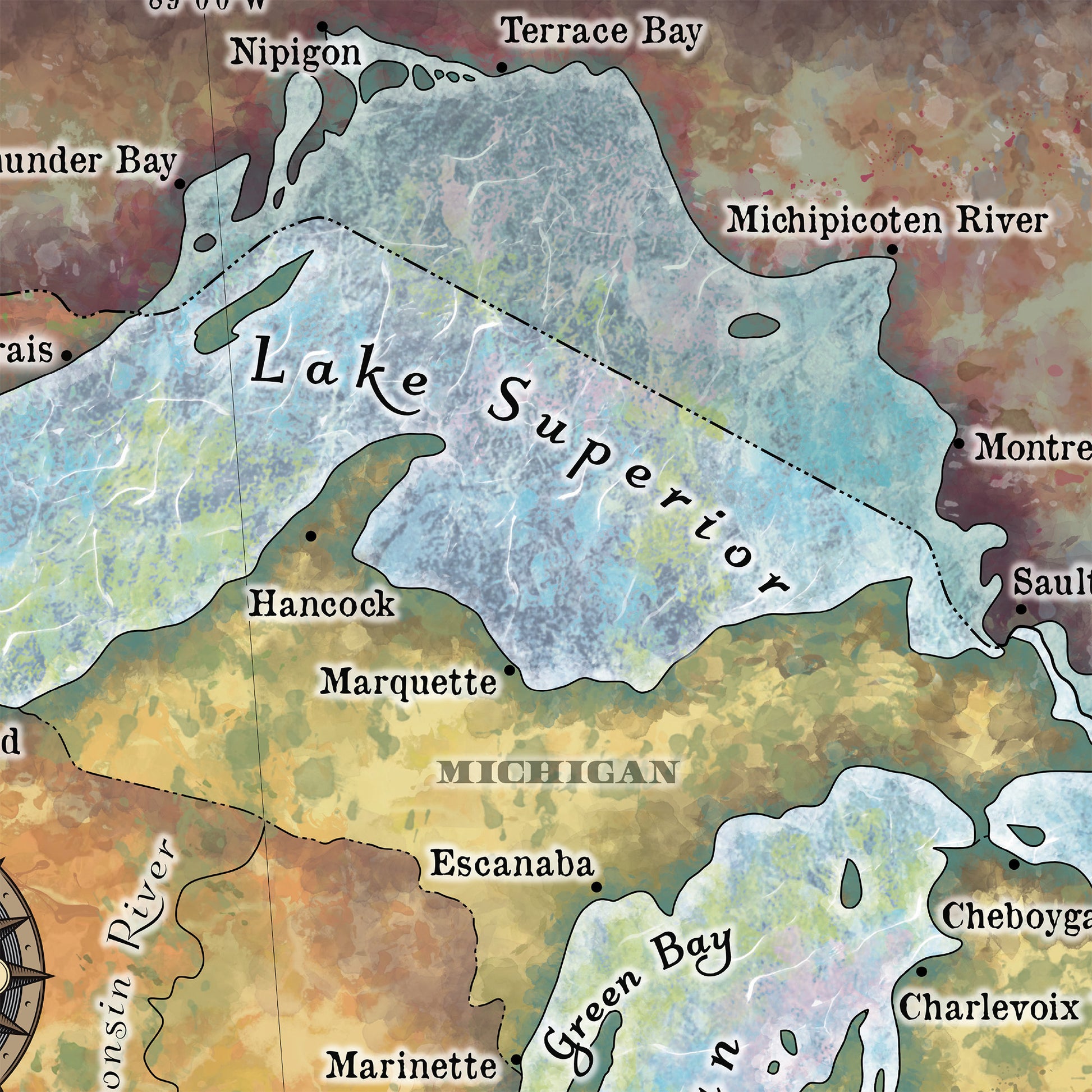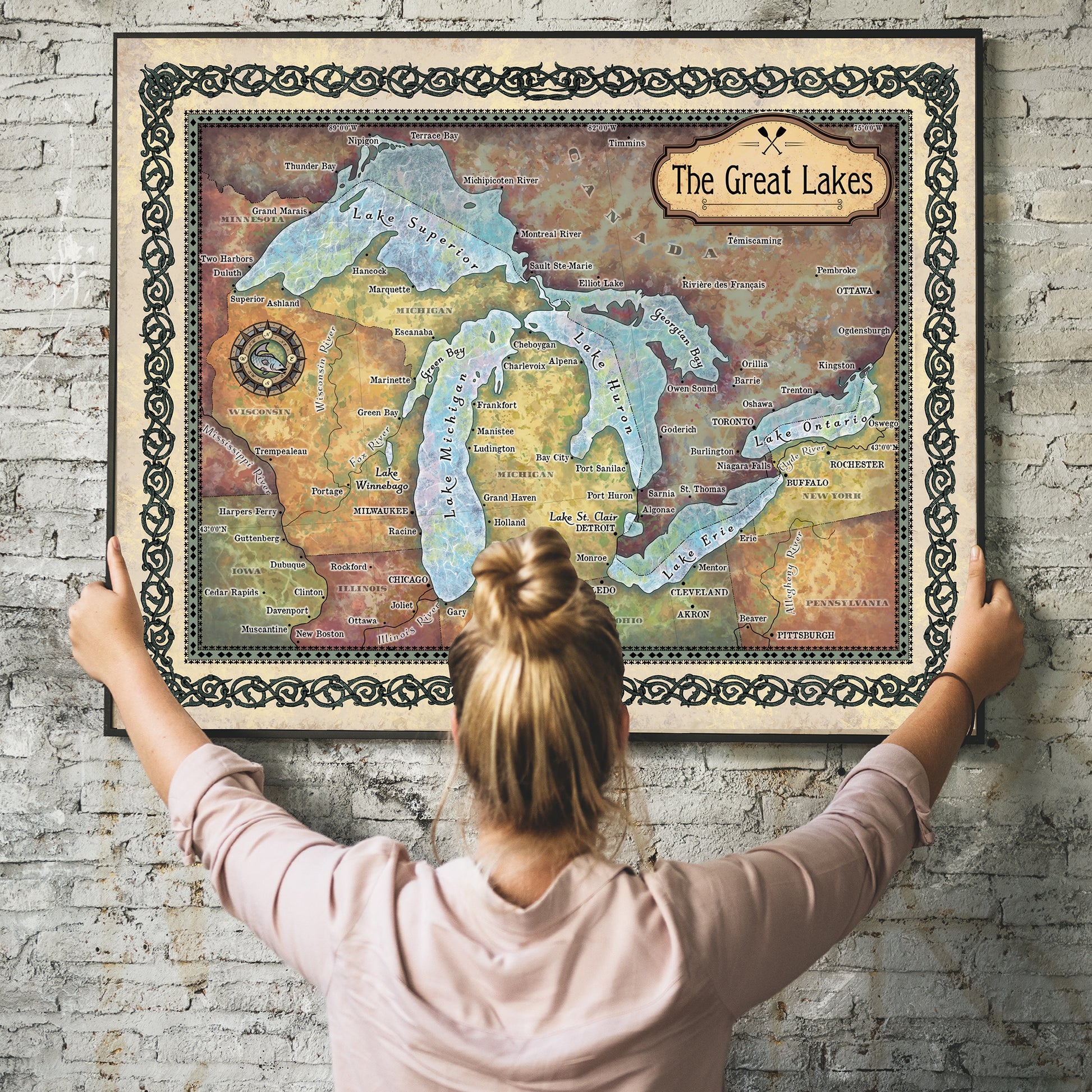 This Great lakes map of the Superior, Michigan, Erie, and Huron Lakes will add a cool freshwater breeze to your living area. Celebrate big water with this wonderful lake art, which matches perfectly with your rustic decor, cabin art, or lake house art. Help kids understand the nature the magic of the great lakes with another fine art piece by Lisa Middleton and the Great River Arts team. Please contact us for a high resolution image to review. Please read more about this map below the product descriptions. Free customization on all orders $125+.