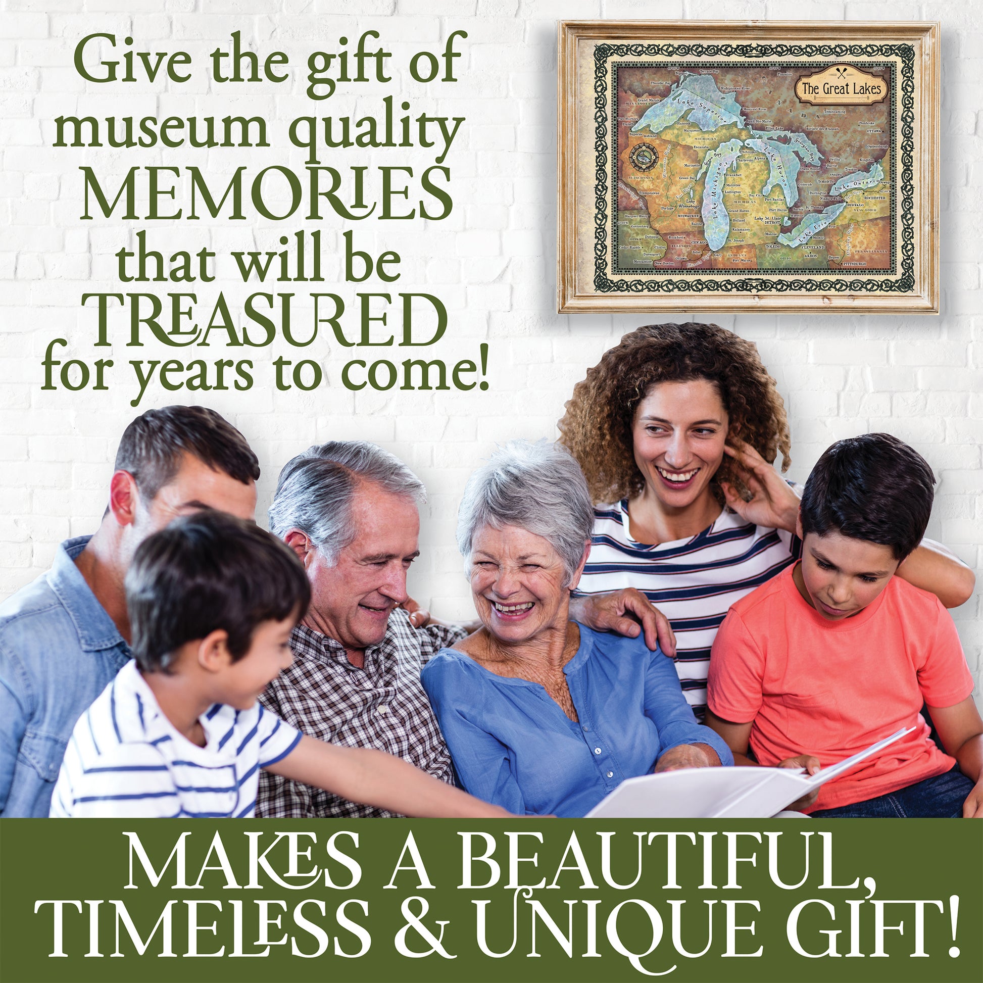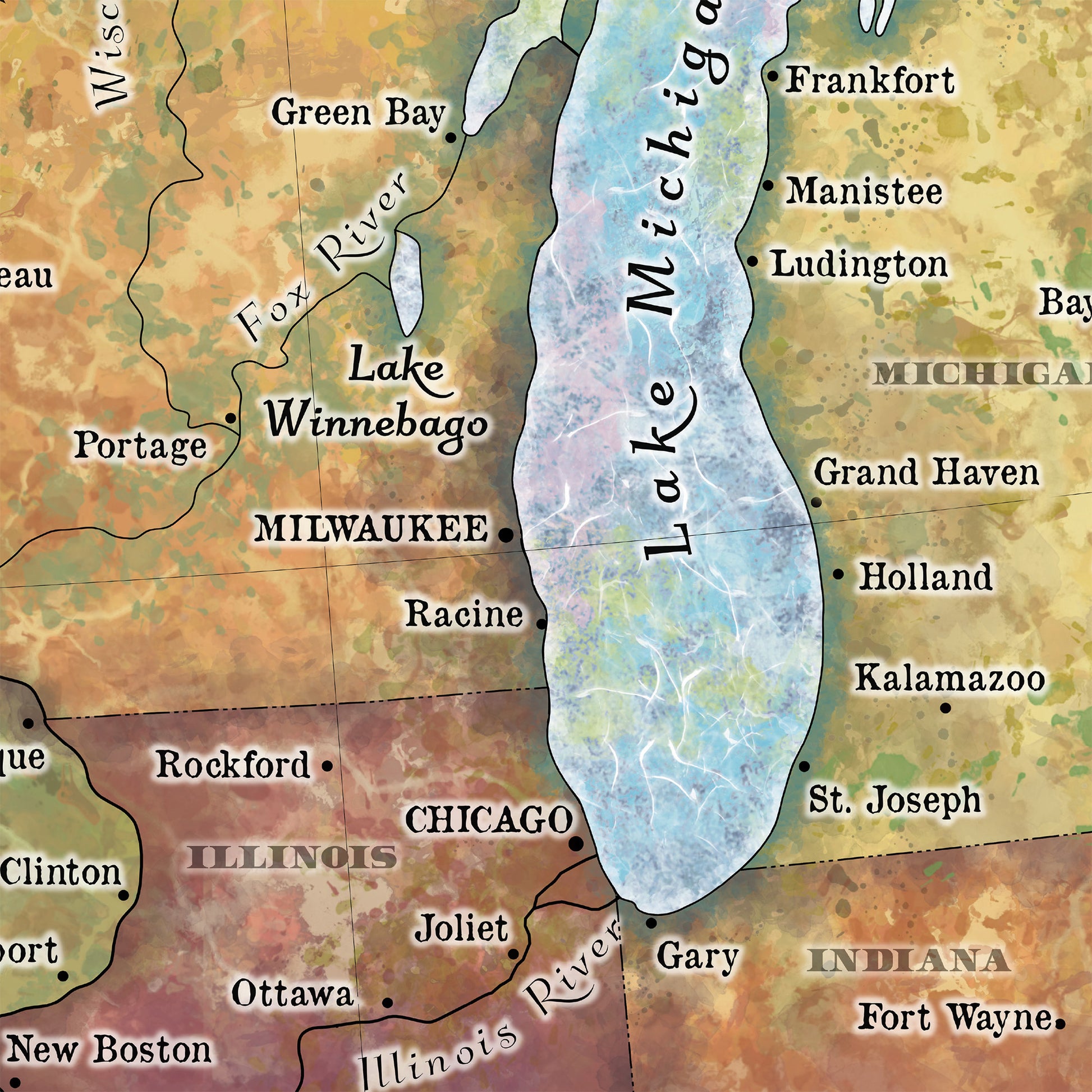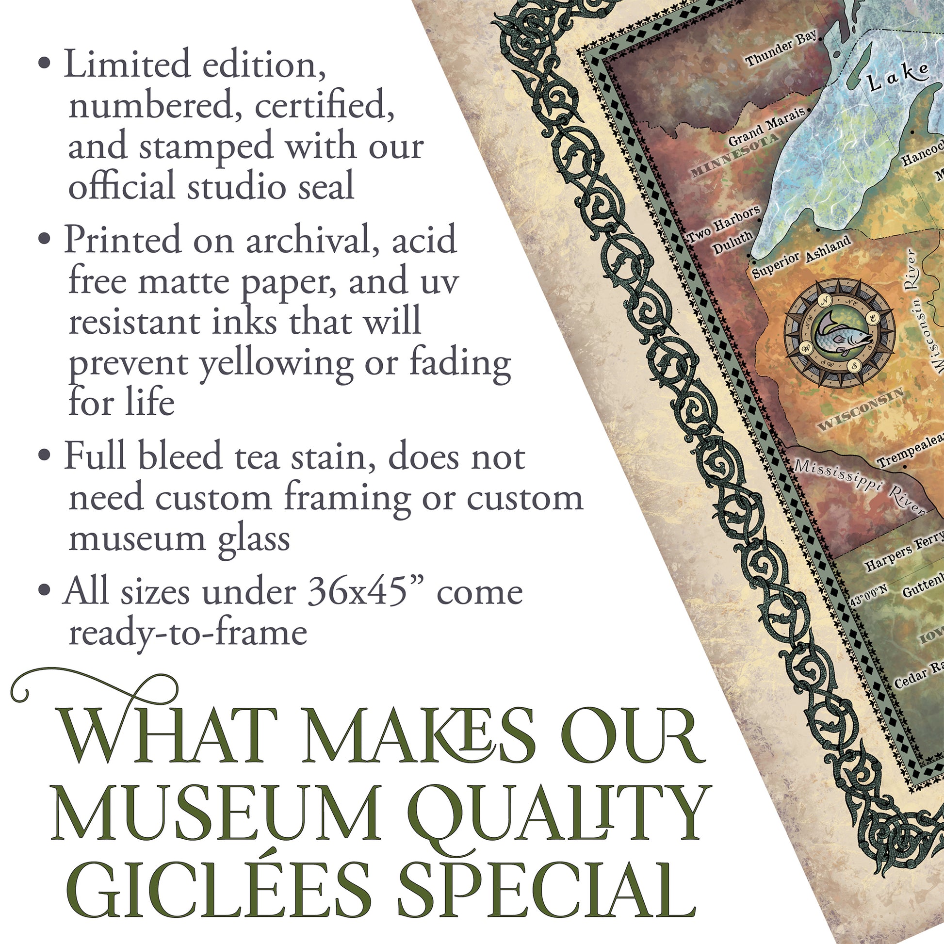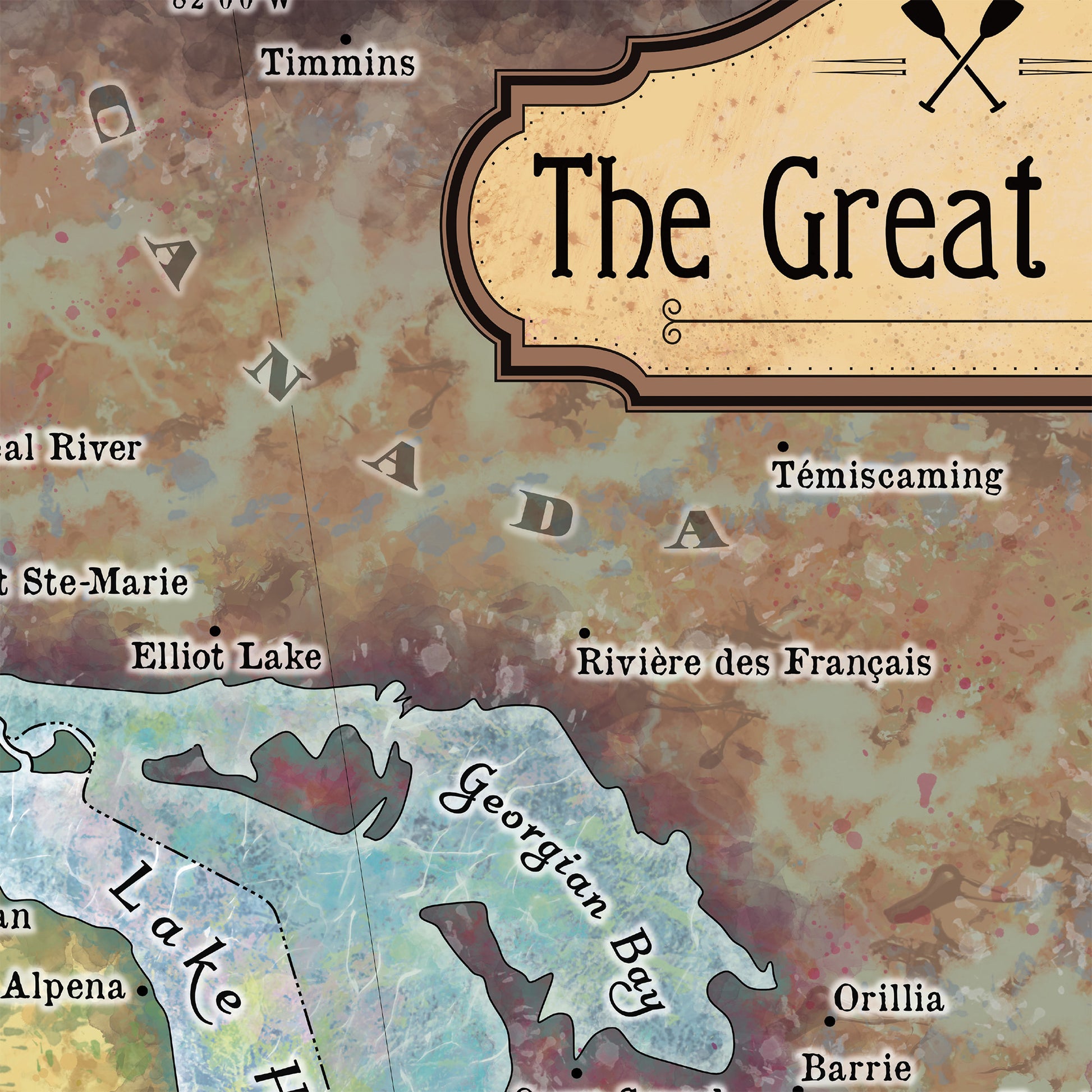 This Great lakes map of the Superior, Michigan, Erie, and Huron Lakes will add a cool freshwater breeze to your living area. Celebrate big water with this wonderful lake art, which matches perfectly with your rustic decor, cabin art, or lake house art. Help kids understand the nature the magic of the great lakes with another fine art piece by Lisa Middleton and the Great River Arts team. Please contact us for a high resolution image to review. Please read more about this map below the product descriptions. Free customization on all orders $125+.
