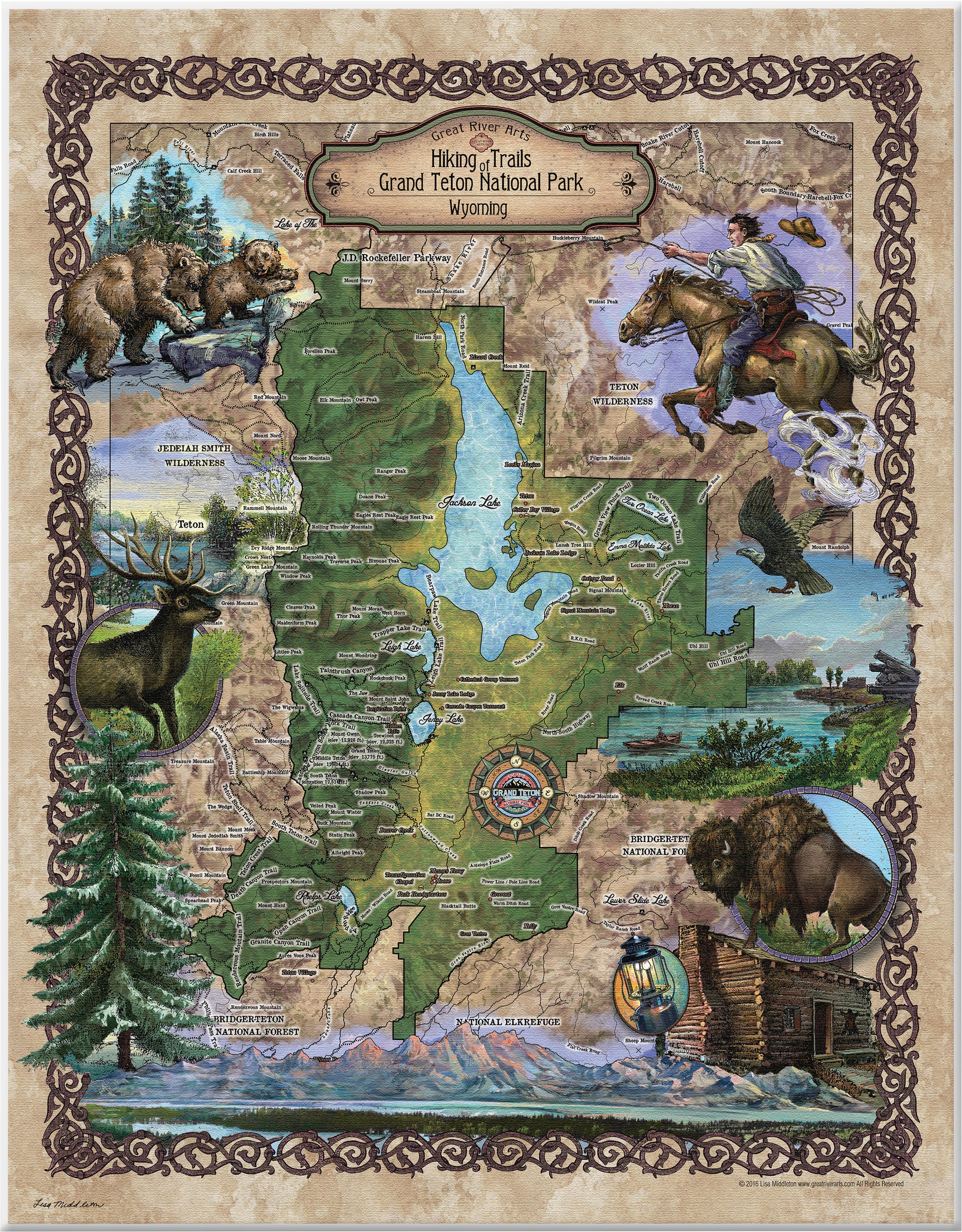 Great River Arts Custom Teton National Park Hiking Trails Historic Map Reproduction Artwork Wall Art Print Vintage