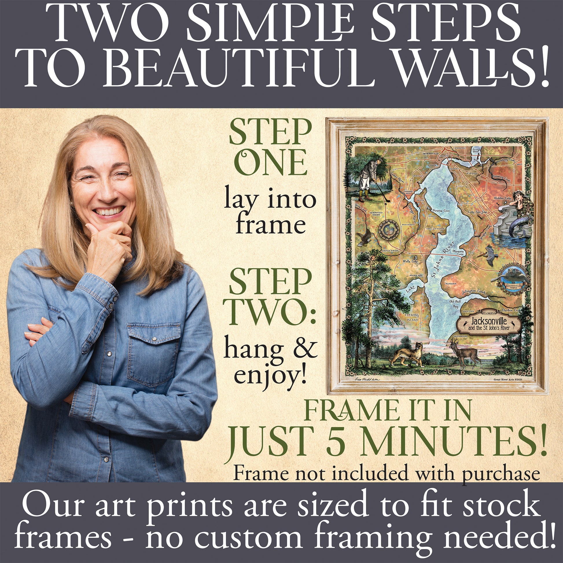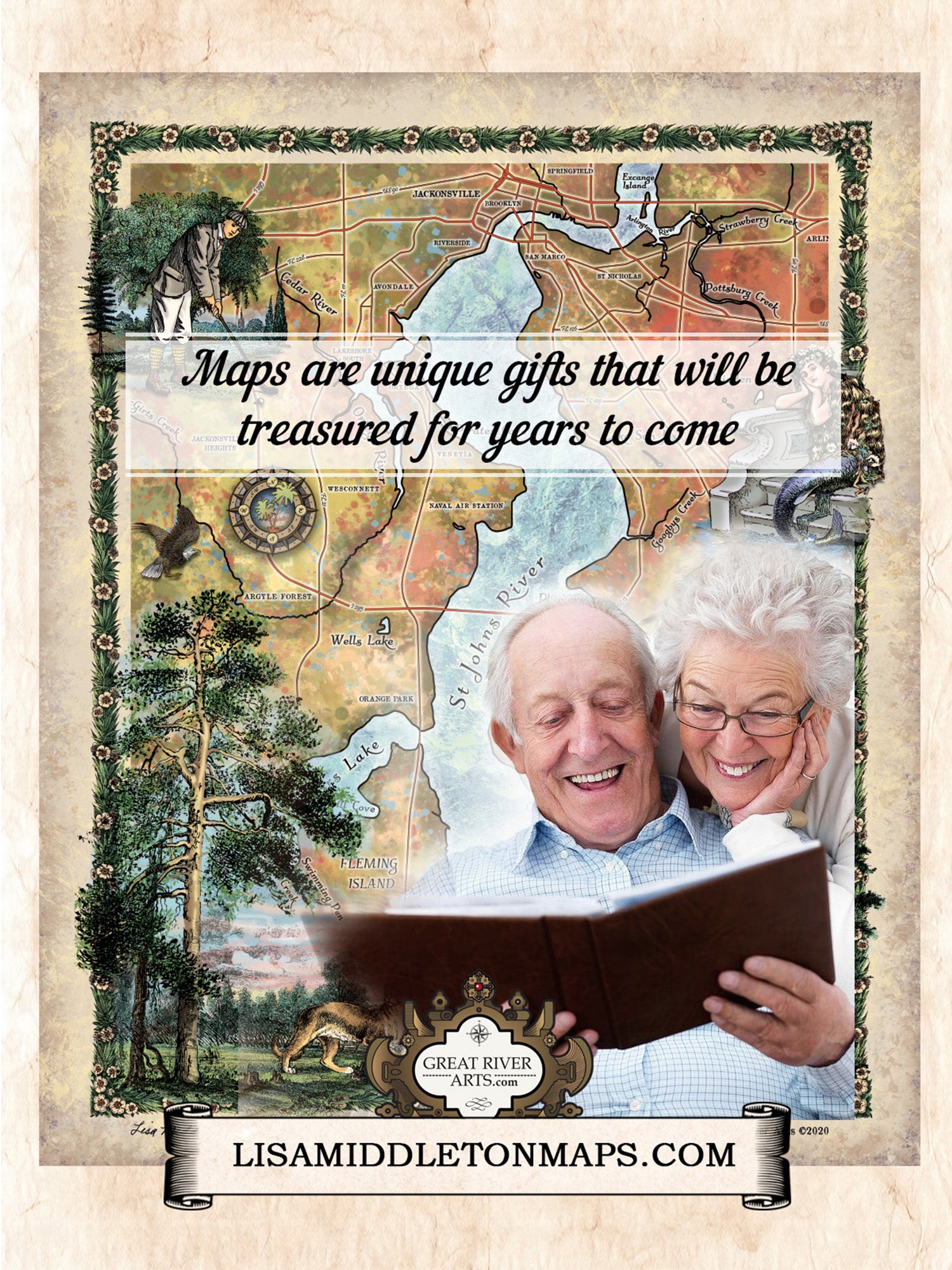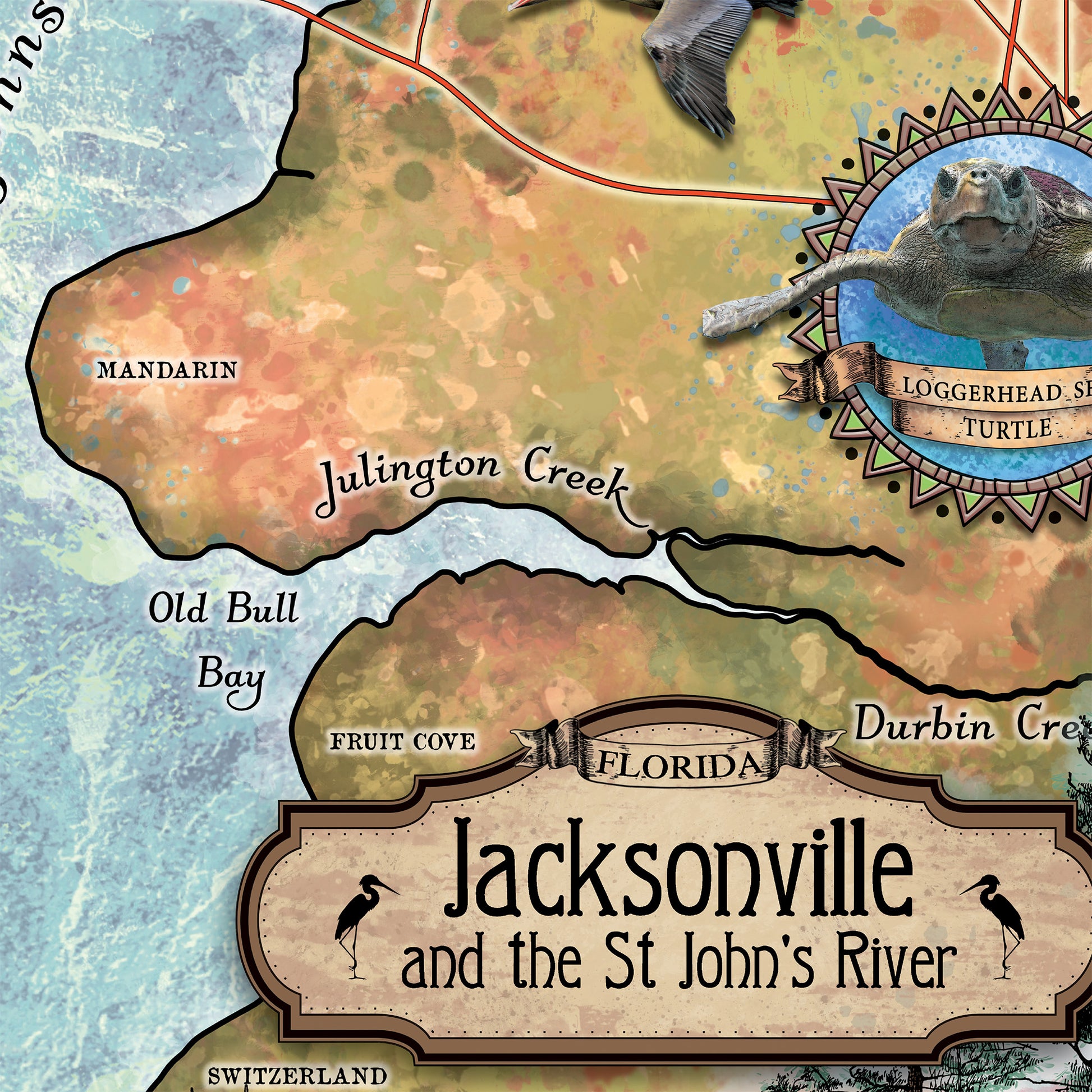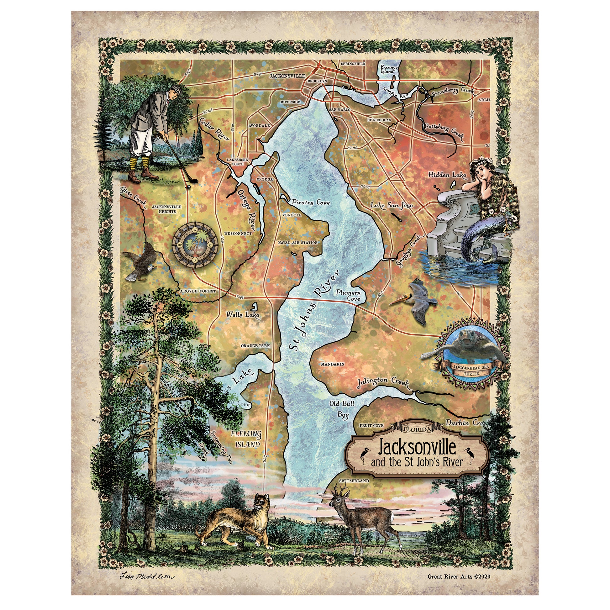Great River Arts Jacksonville and The St. John's River Historic Map Reproduction Artwork Wall Art Print Vintage