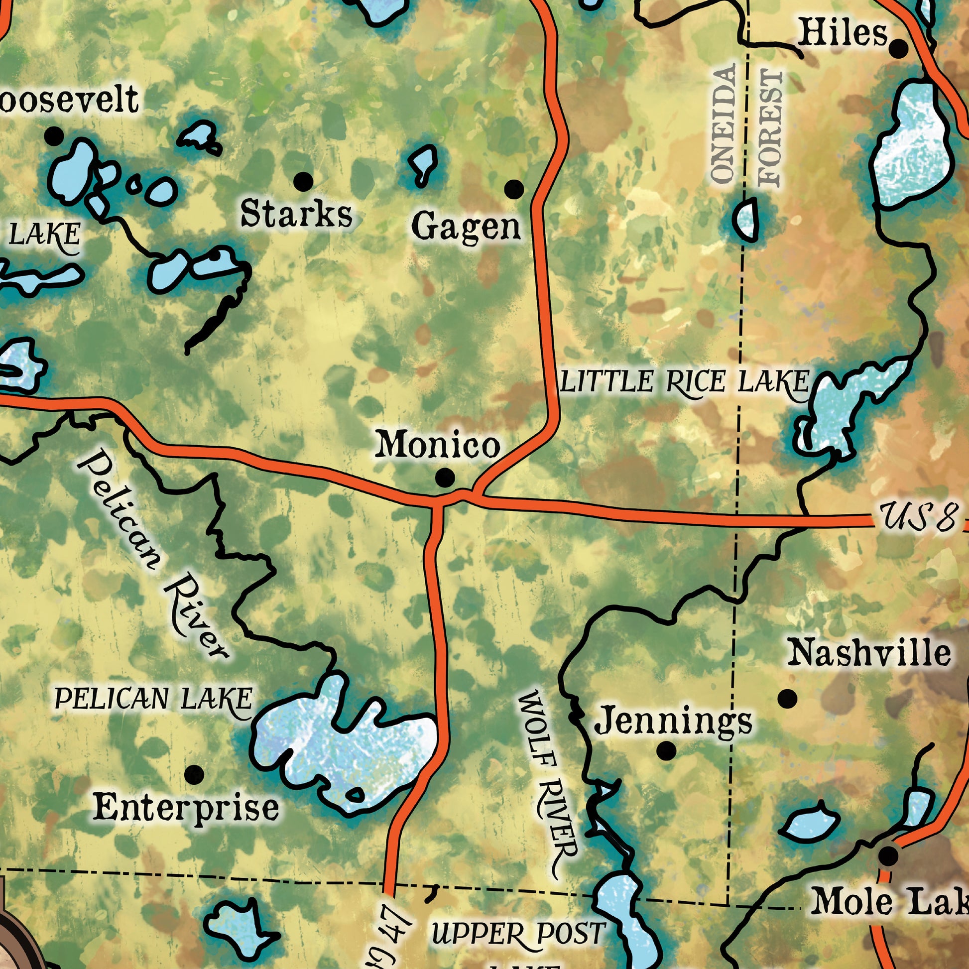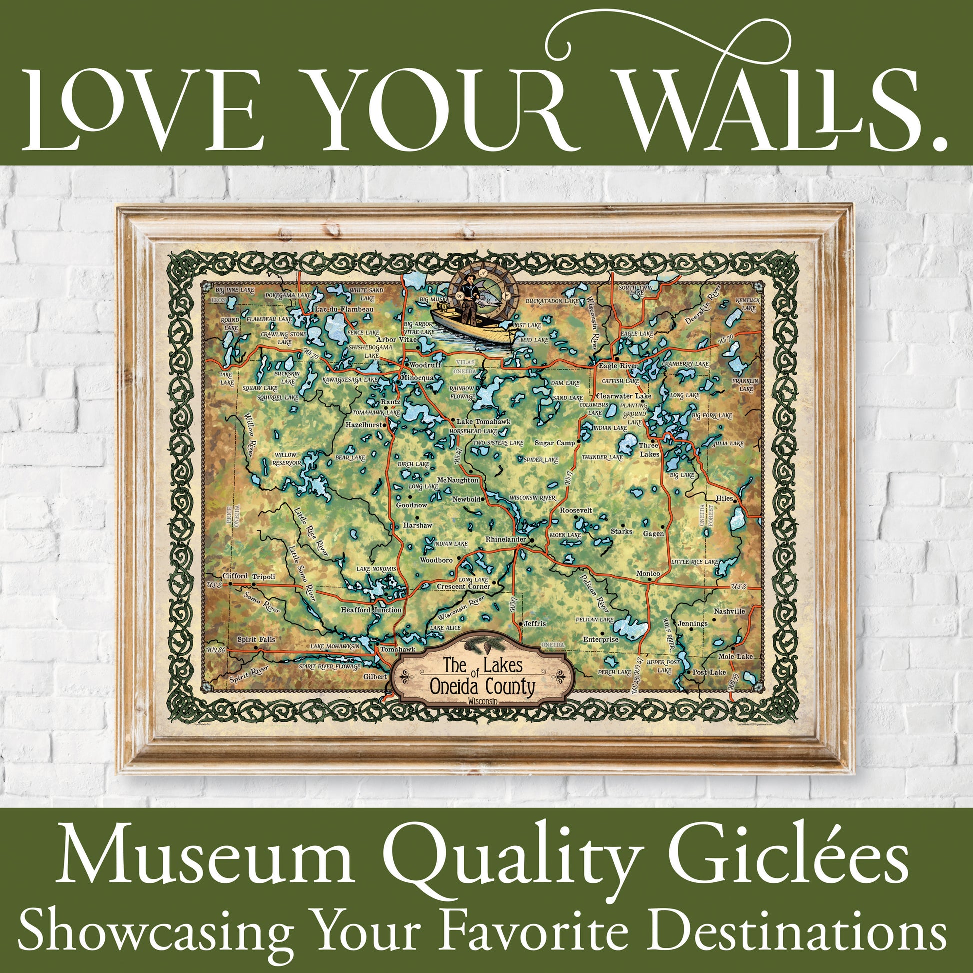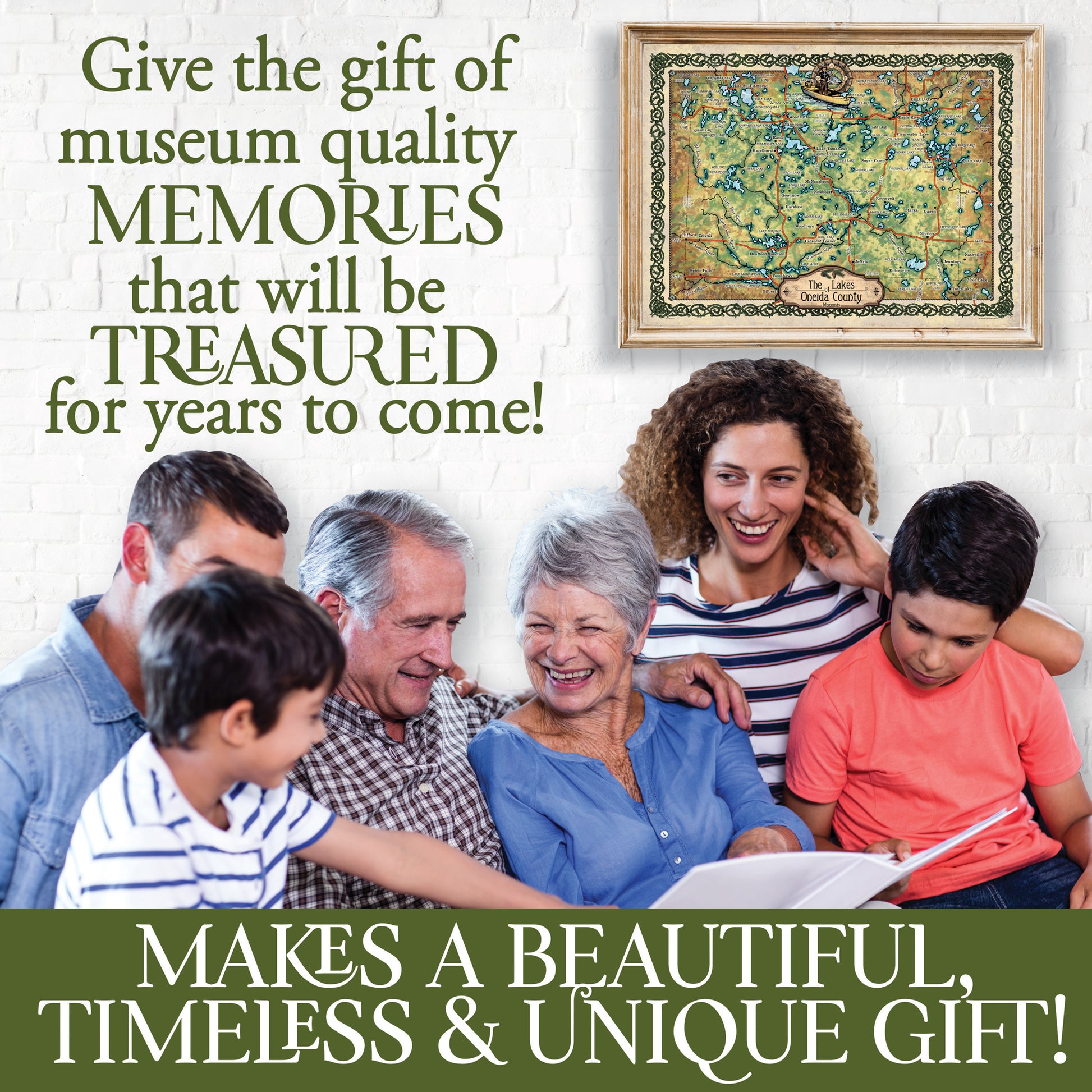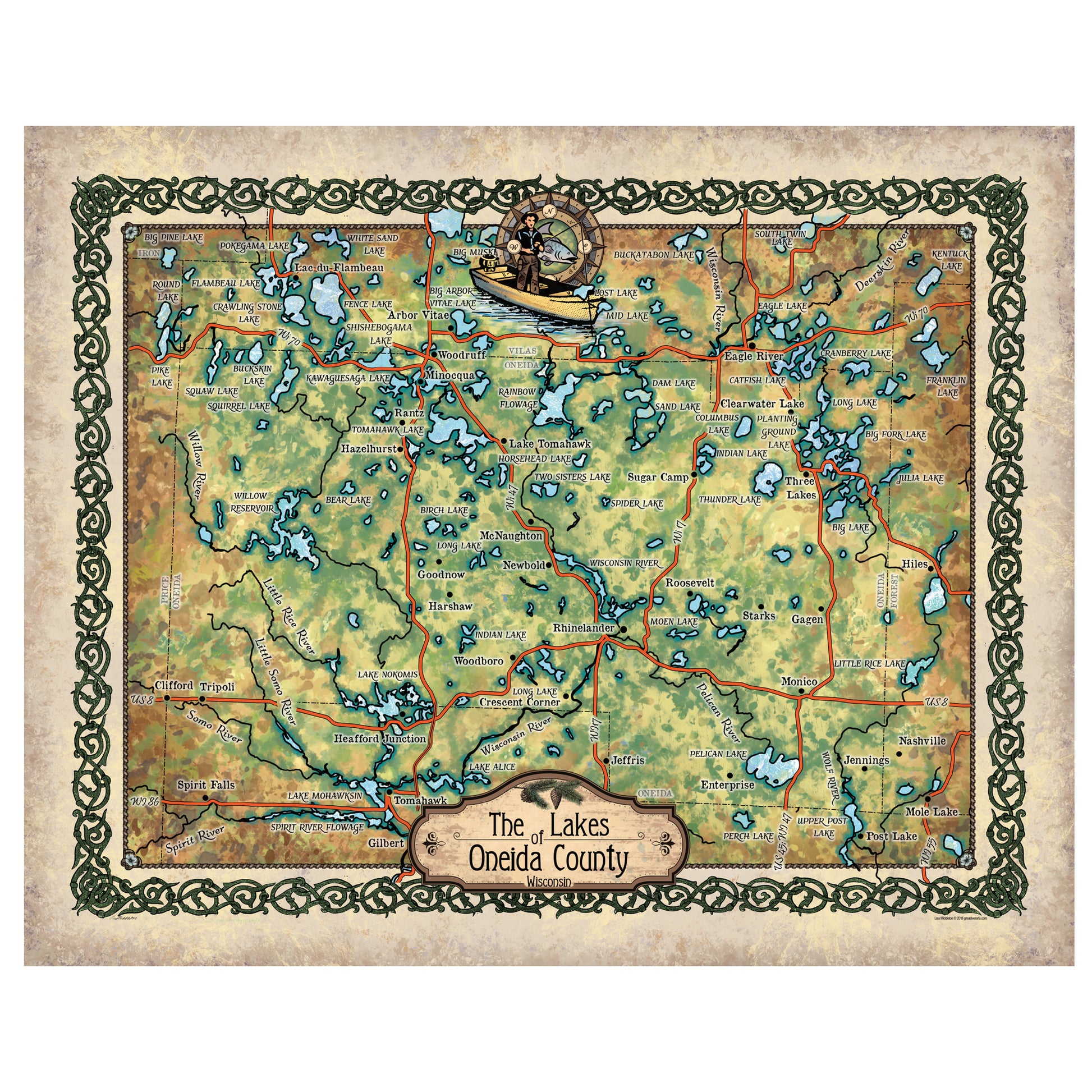 Great River Arts Lakes of Oneida County Historic Map Reproduction Artwork Wall Art Print Vintage