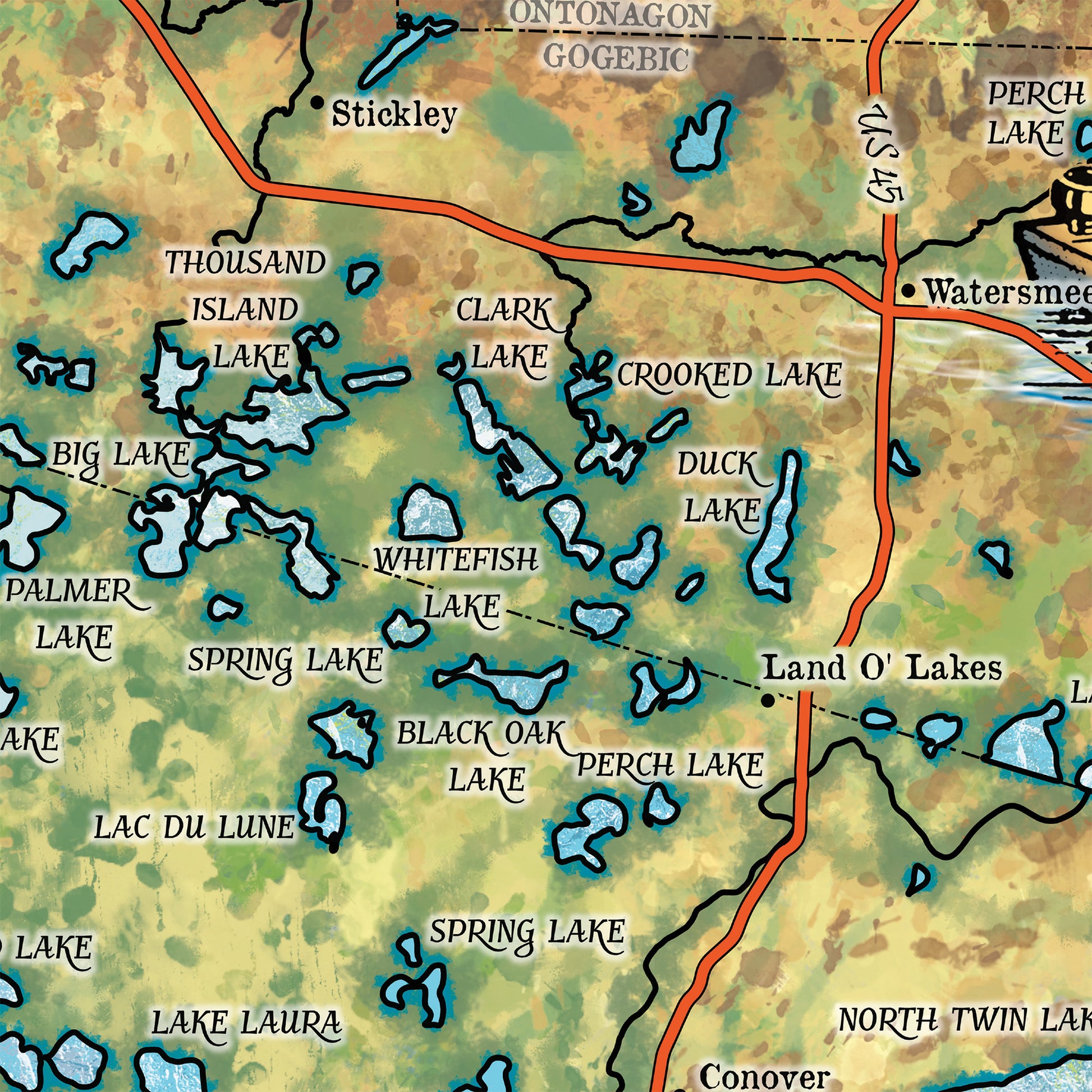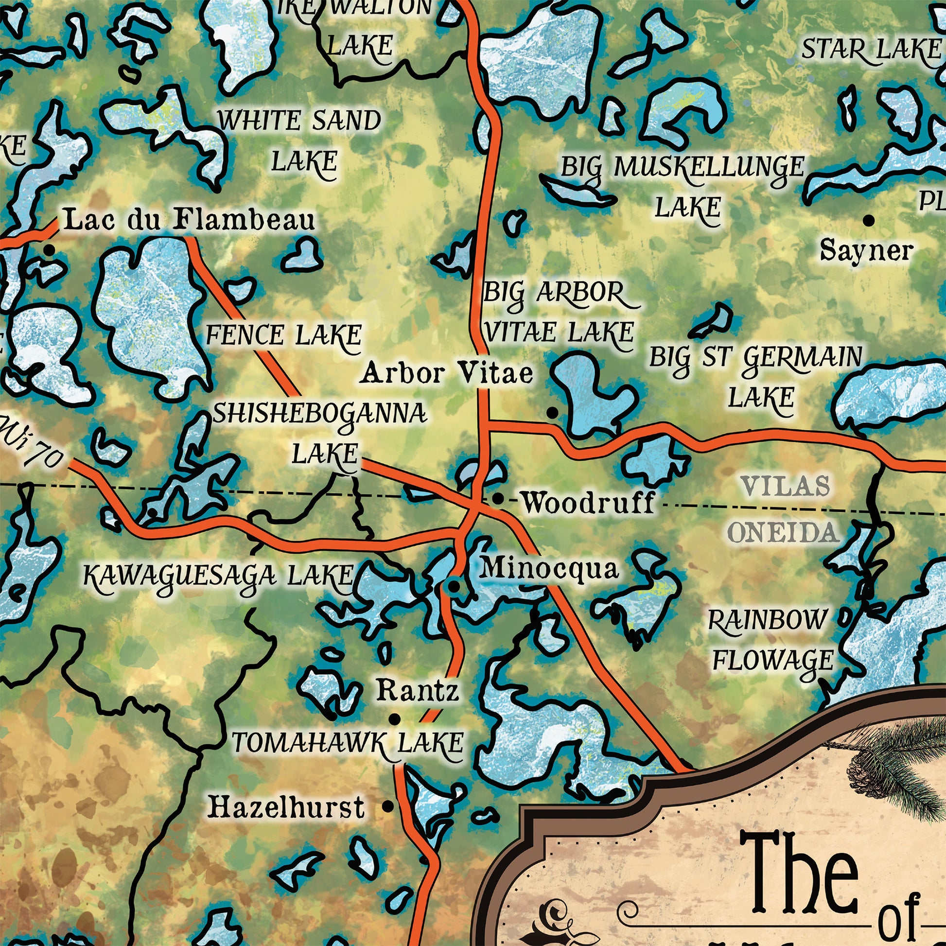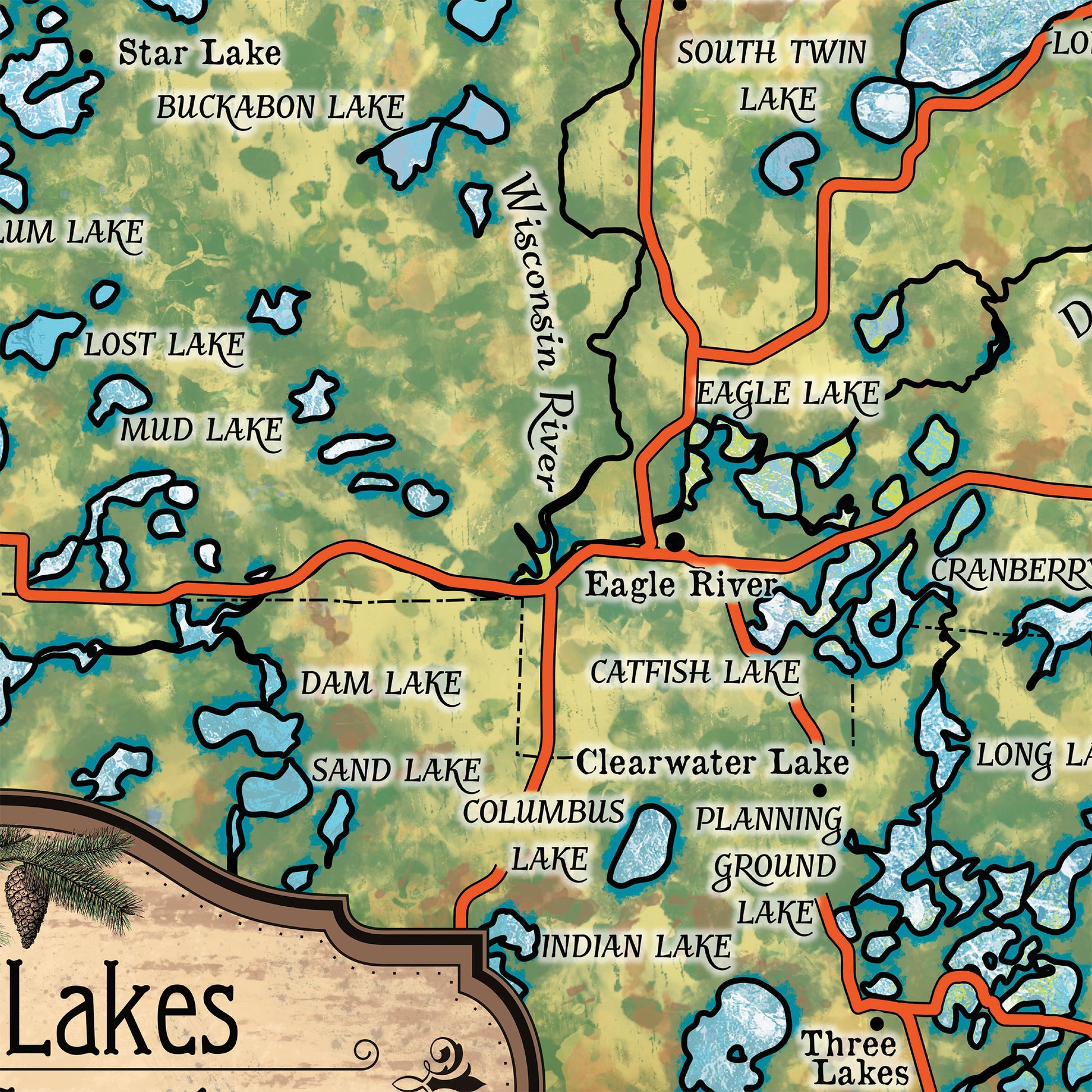 Great River Arts Lakes of Vilas County Historic Map Reproduction Artwork Wall Art Print Vintage