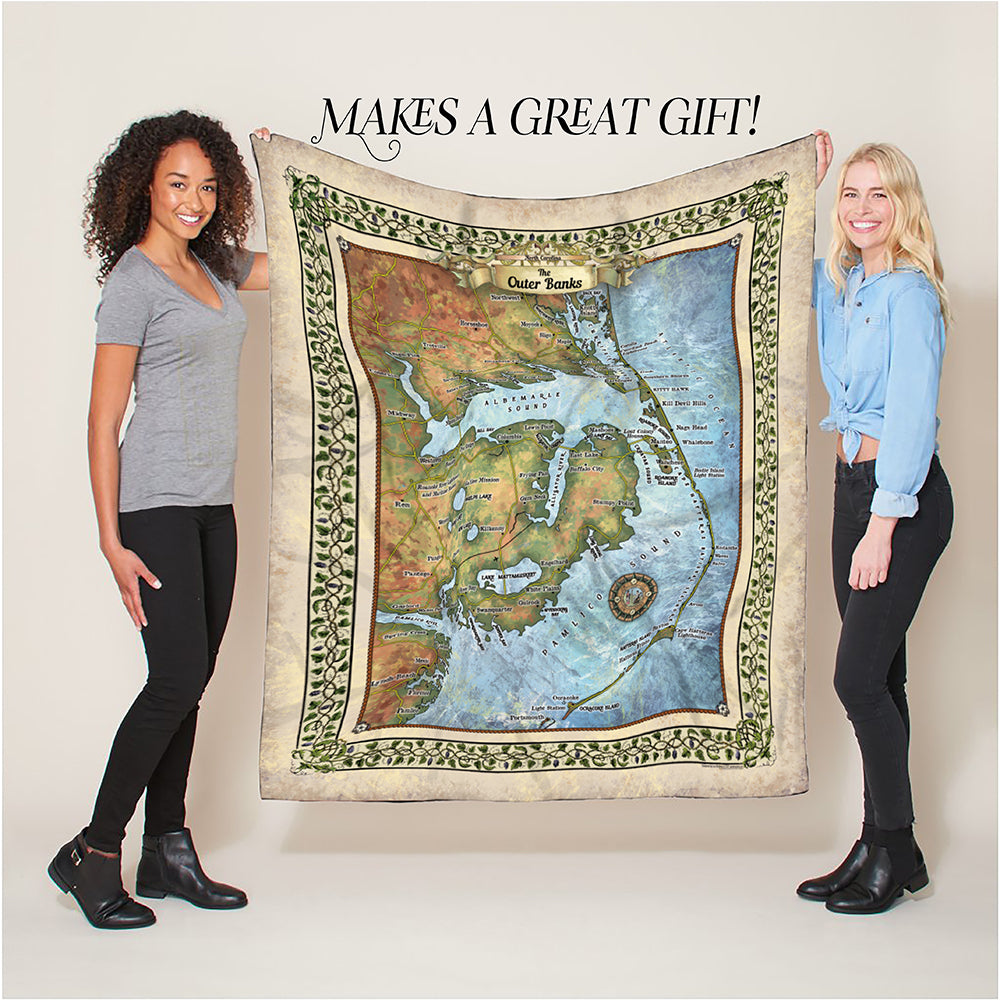 Outer Banks North Carolina Vs.2 Vintage Style Map - Sherpa blanket, silky fleece blanket and polar fleece blankets perfect for Mom gifts, Dad gifts, children gifts, and travel gifts. Ideal lake house decor, cabin decor, tropical décor for guest blankets, living room blankets, and anywhere you want to add a beautiful map blanket of your favorite place.