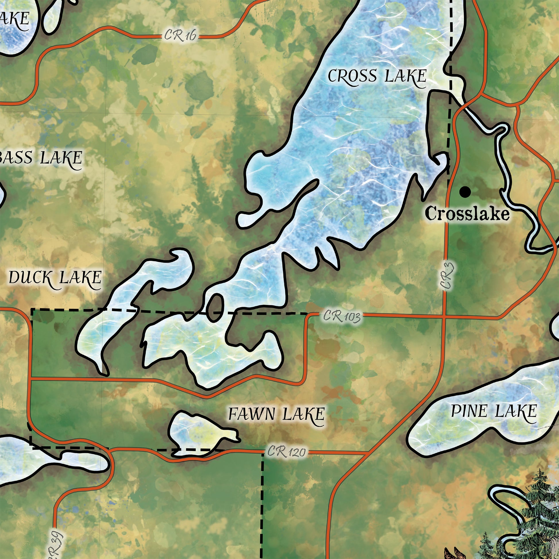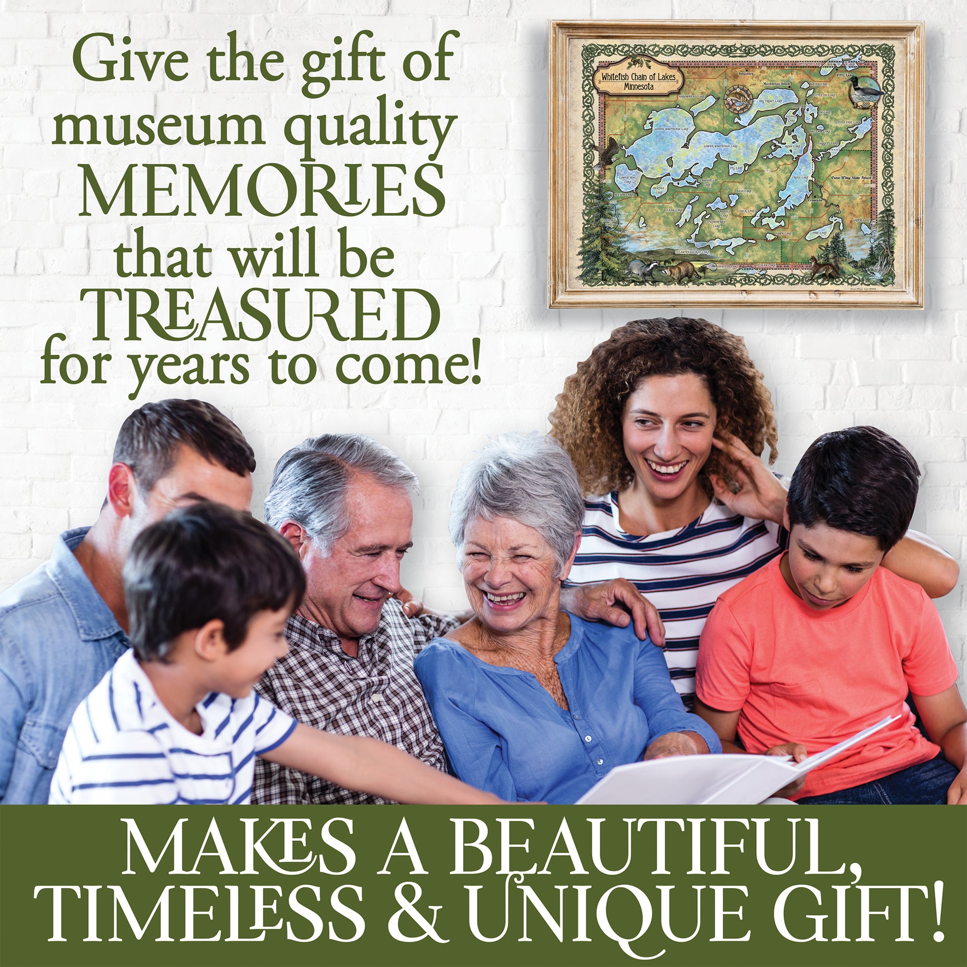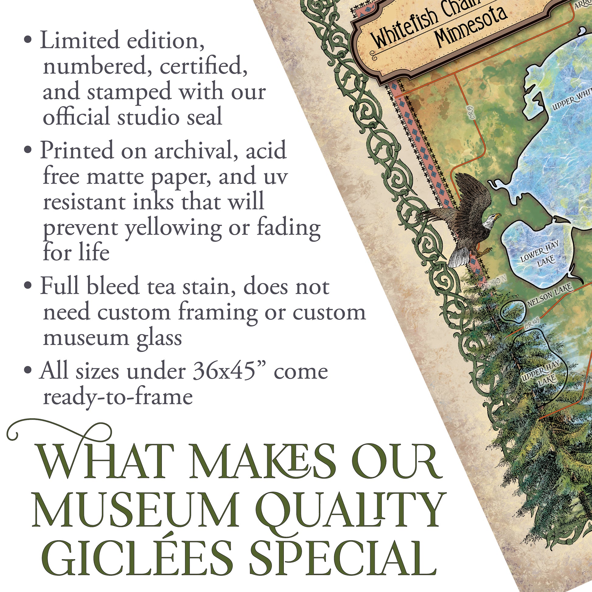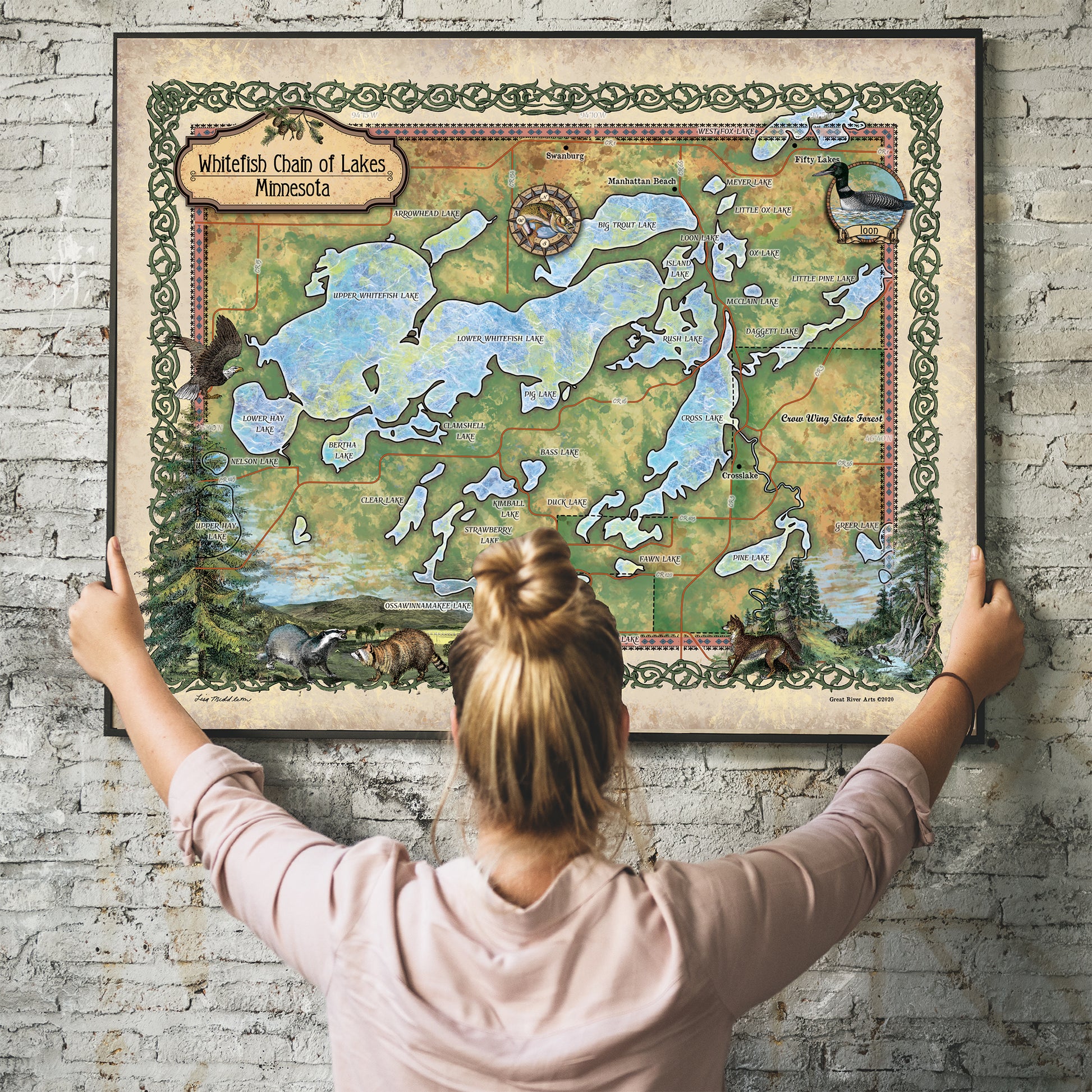 Great River Arts Whitefish Chain of Lakes with Illustrations Historic Map Reproduction Artwork Wall Art Print Vintage