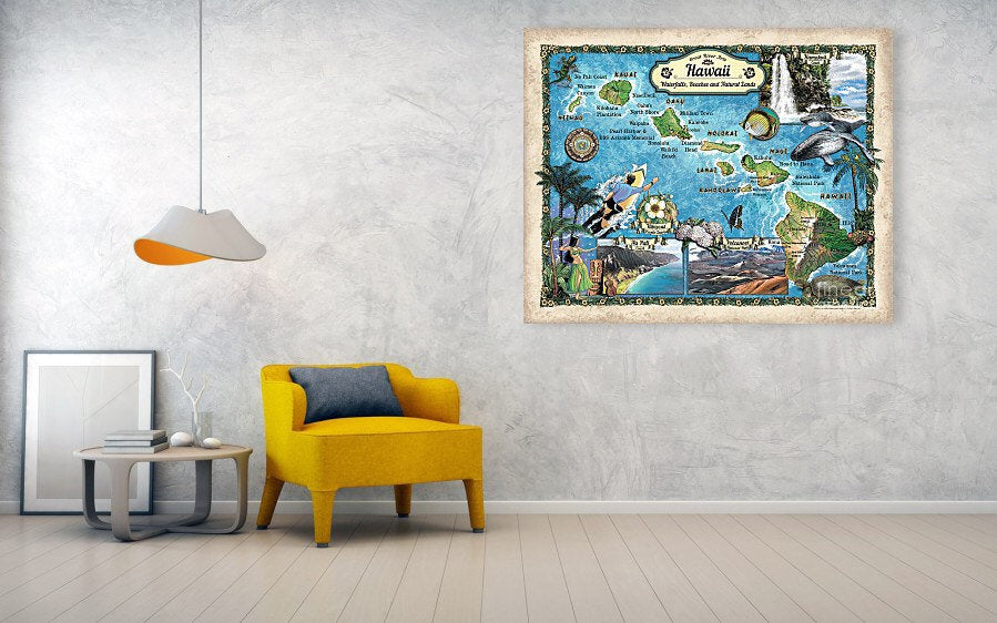 Grab your lei and bring a piece of Hawaii's surf into your home with a watercolor wall art print of the Aloha state - the perfect Hawaii gift. Most who have been been there agree - Hawaii is unlike any other place on Earth. Hawaii is made up of eight major islands and more than 100 smaller islands, islets, and atolls; the largest six each over 100 square miles in area. Each island is uniquely different, with its own personality, adventures, and scenery, and are exquisitely depicted on this tropical, vintage style wall art print. The perfect surfing gift - this piece will transform your space into an oceanic paradise.