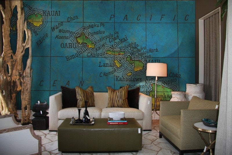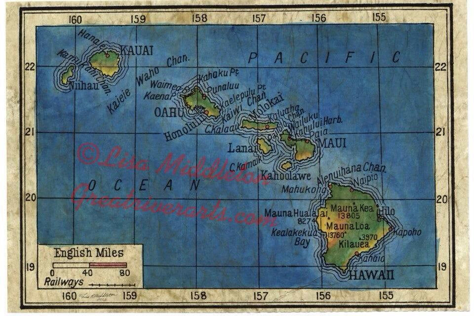 Beautiful hand painted reproduction of Bartholemew's Hawaii 1906 map. A feast for the eyes and a top seller. Features all the islands, channels, and volcanoes.