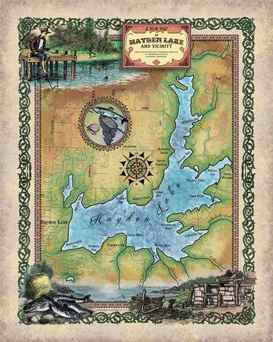 Hayden Lake, idaho, Idaho lake, lake map, lake life, lake art, lake house, vintage lake map, lake gifts, idaho gifts, idaho lakes, fishing