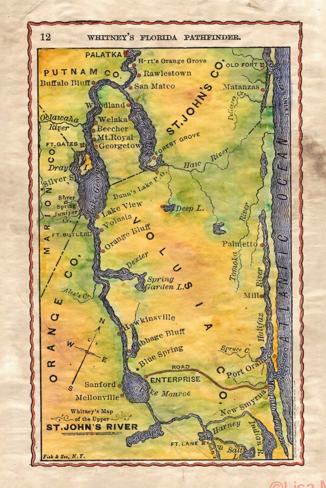 Featured in this map of the Upper St. John's River are tourist towns of note, that dot the river along the way, as well as an access road to the coast, stretching from the river to the Atlantic, near Port Orange.