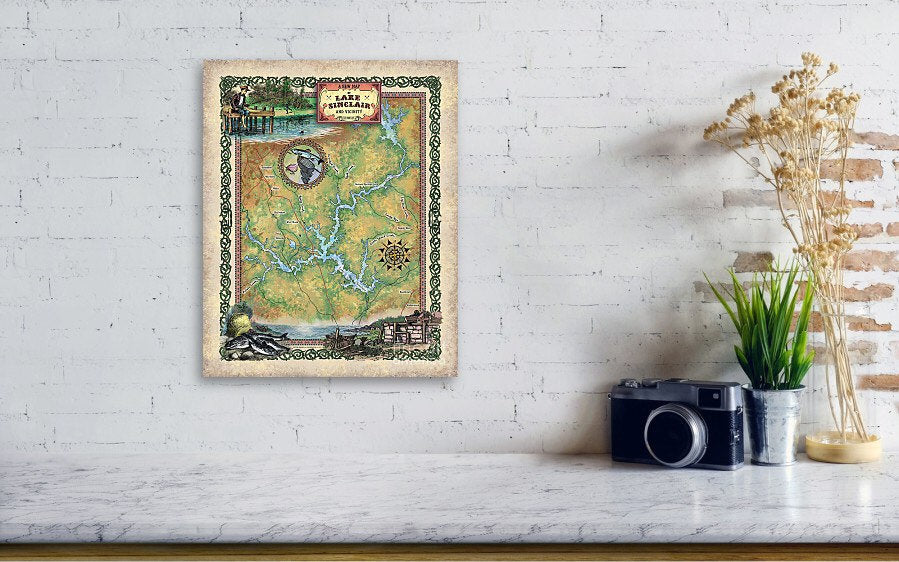 This beautifully painted wall map oversize wall art lake house decor map of Lake Sinclair, Georgia is is one of our most beautiful lake maps in our lake art collection- perfect for you lake house! It's vintage makes this a perfect lake map gift for your family lake home, or for any new resident in your neighborhood. See our entire collection of Georgia lake art!