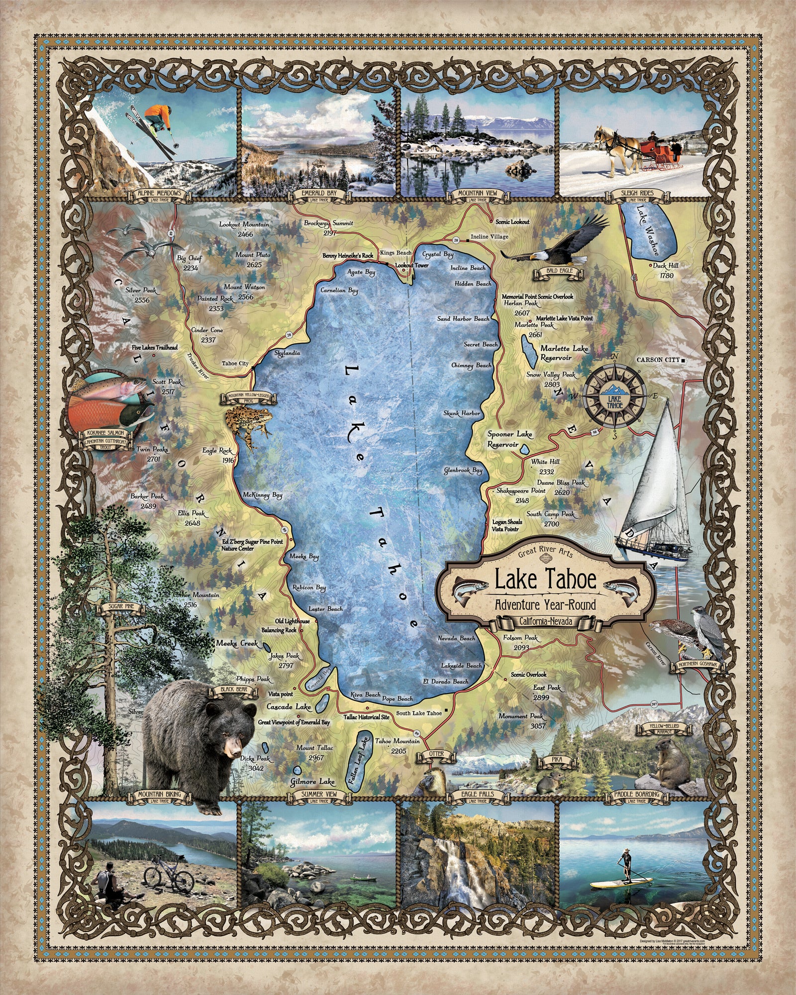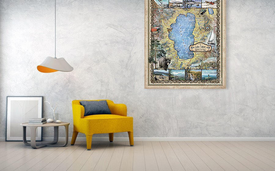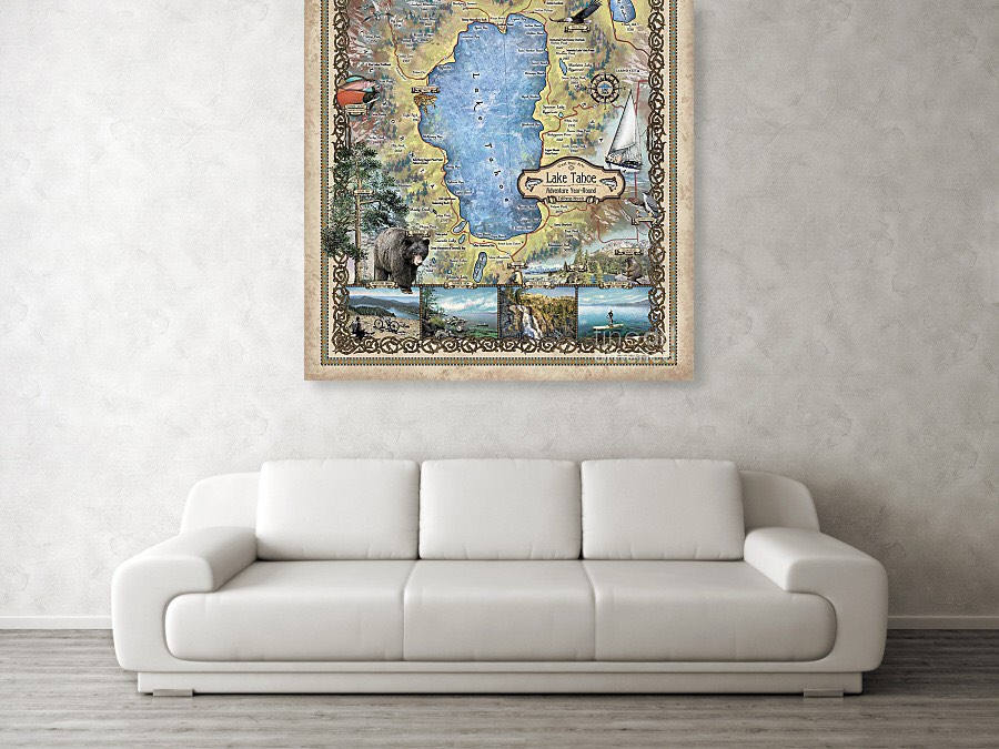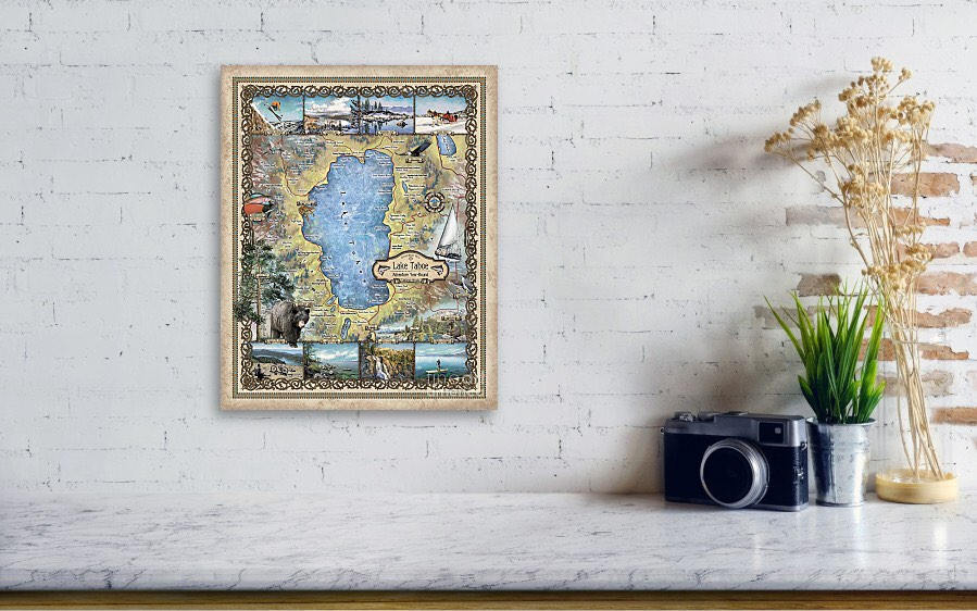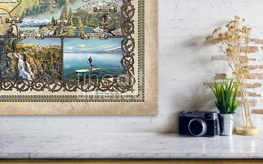 Bring home the year-round adventure of Lake Tahoe with this beautifully detailed map art print by Lisa Middleton and her Team. The unique tones create a fresh palate in your Tahoe home or office. Great as gifts or feature piece just for you, our unfadable inks and timeless design will provide a years of enjoyment in a guest room, entry way, living room.