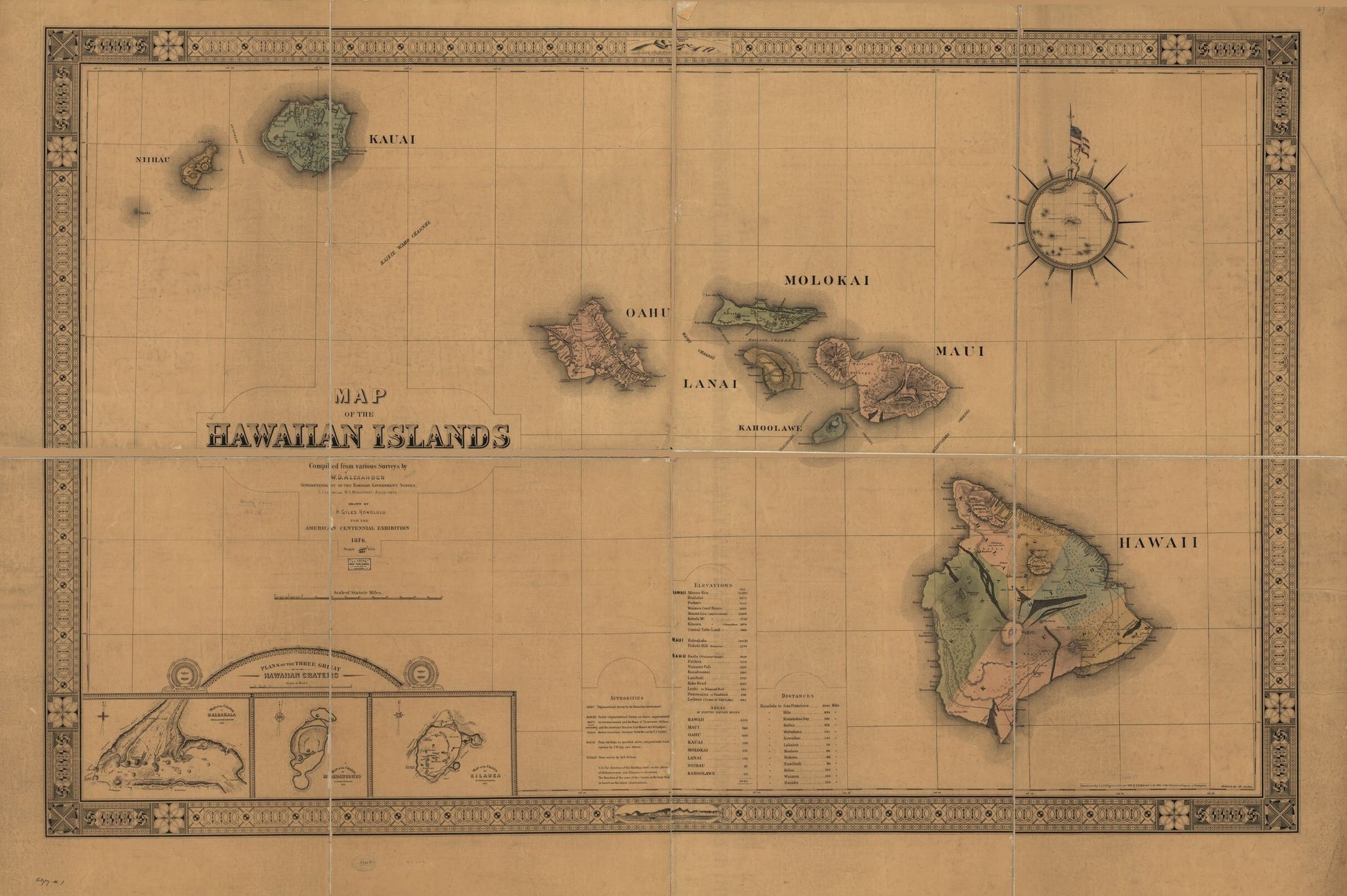 Under the direction of William D. Anderson, Surveyor General of the Hawaiian Government Survey, Map of the Hawaiian Islands, 1876 was created and published for the celebration of the 100th anniversary of American independence by J. L. Smith Co. More specifically, it was for the Hawaiian Exhibit at the International Exhibition of Arts, Manufactures and Products of the Soil and Mine in Philadelphia. This map is regarded as the first major map published by the Hawaiian Government Survey. It was compiled from various surveys by individuals that include Curtis Lyons, assistant surveyor, North Hawaii, W. D. Alexander, superintendent of the Hawaiian Government Survey and M.D. Monsarrat, assistant surveyor. H. Giles of Honolulu was responsible for the final drawing of the map.