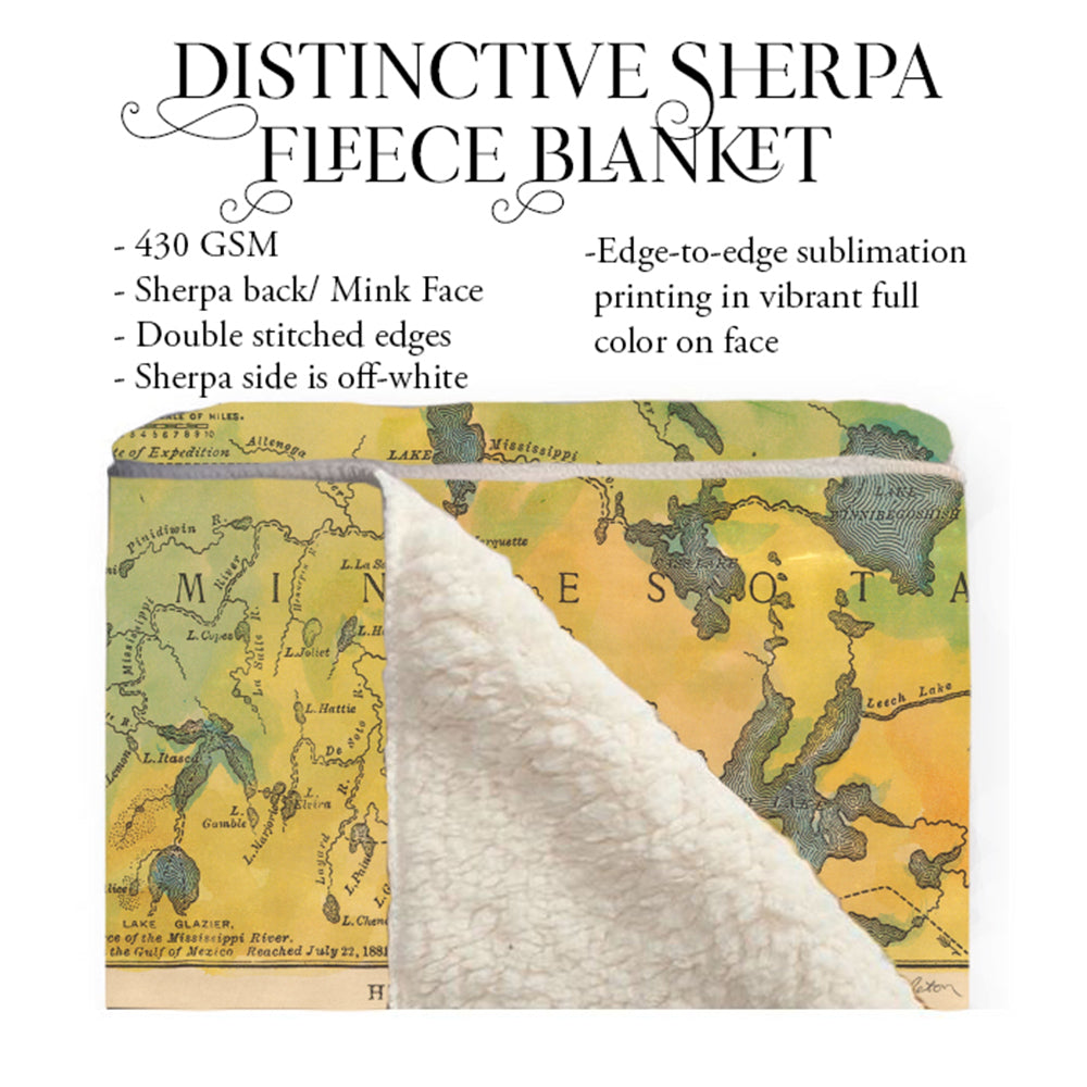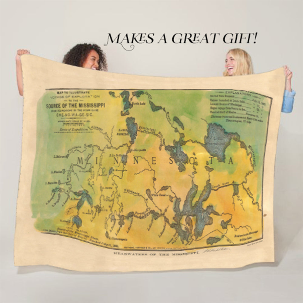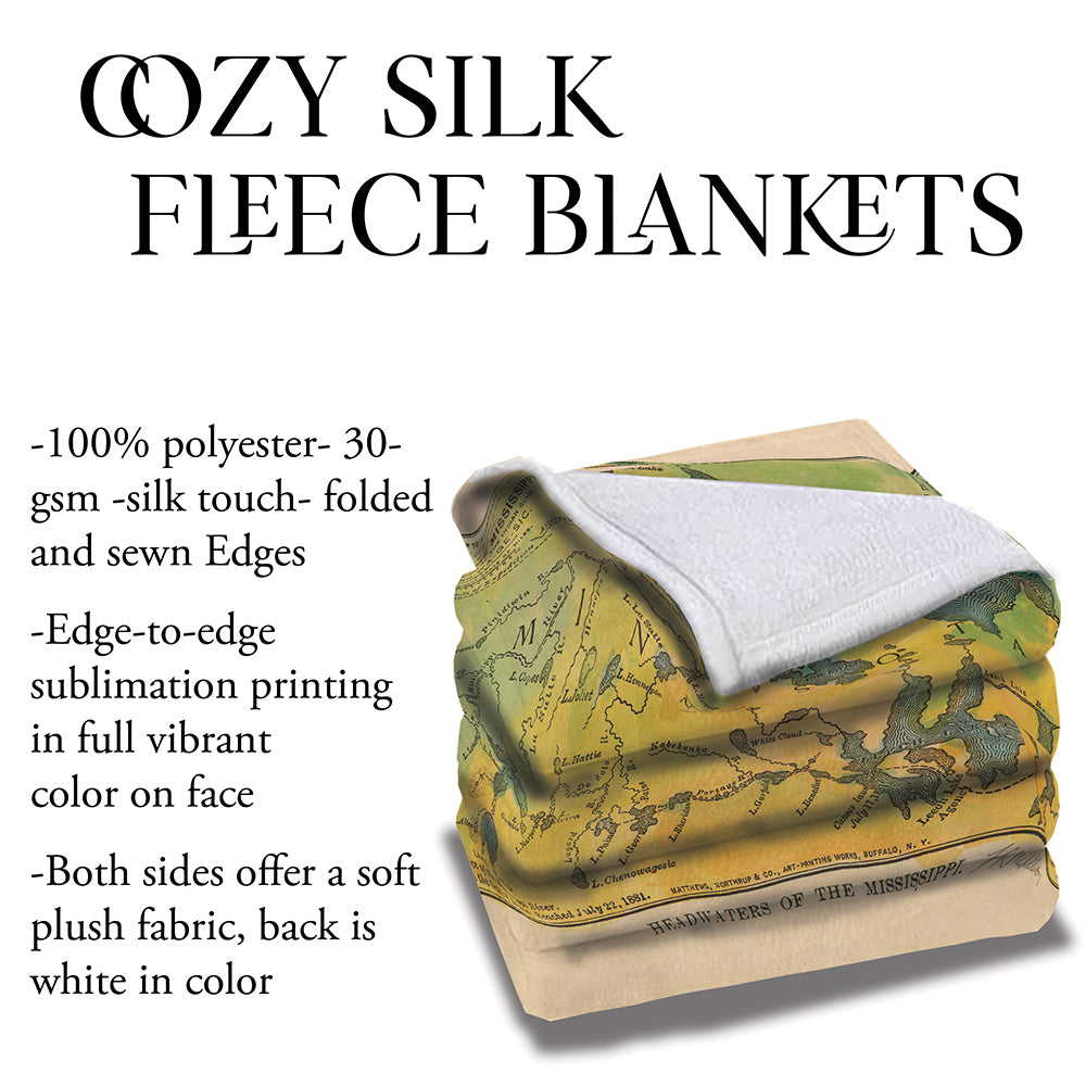 Minneosta Mississippi River Lake Itaska Map - Sherpa blanket, silky fleece blanket and polar fleece blankets perfect for Mom gifts, Dad gifts, children gifts, and travel gifts. Ideal lake house decor, cabin decor, tropical décor for guest blankets, living room blankets, and anywhere you want to add a beautiful map blanket of your favorite place.