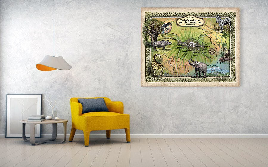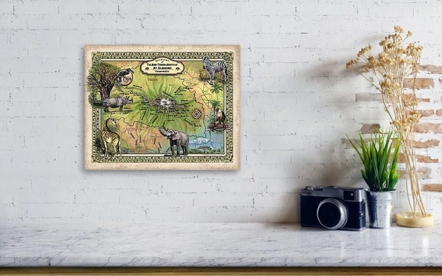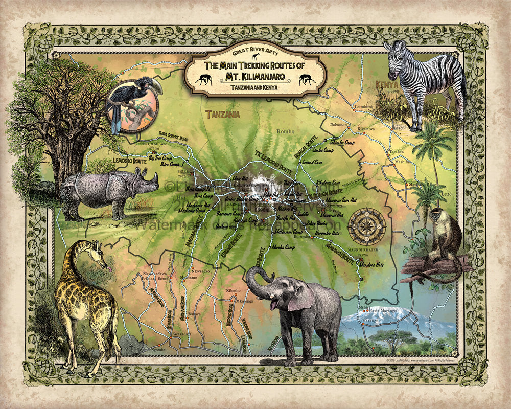 Celebrate the beauty and splendor of Africa's tallest peak, with a Mt. Kilimanjaro trail map fine art print, by Lisa Middleton. Featuring beautiful animals and the most popular hiking routes up Kilimanjaro, our trail map is a stately and refined way to memorialize your love for Tanzania's highest peak, and the world's highest free-standing mountain.