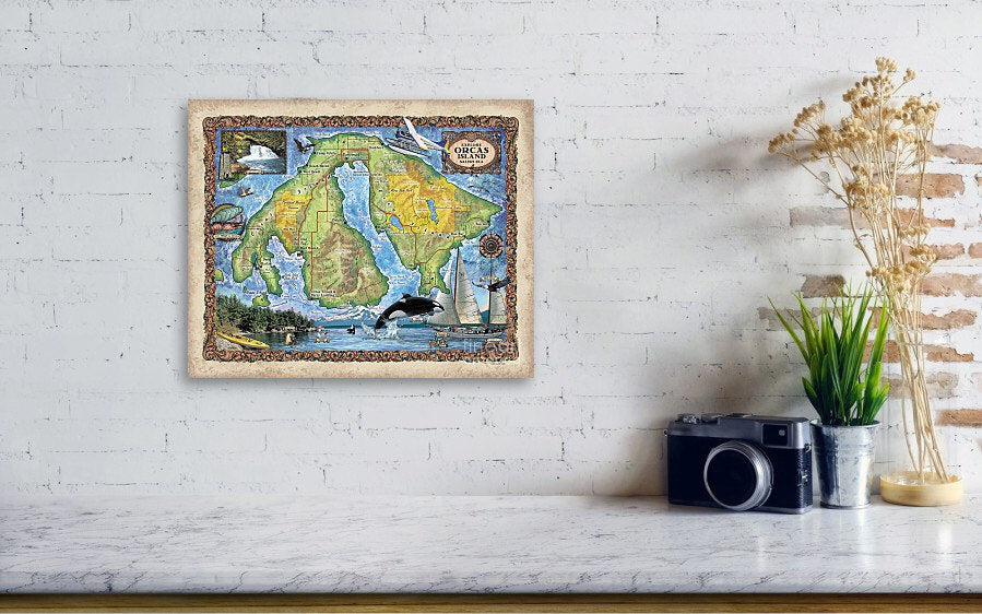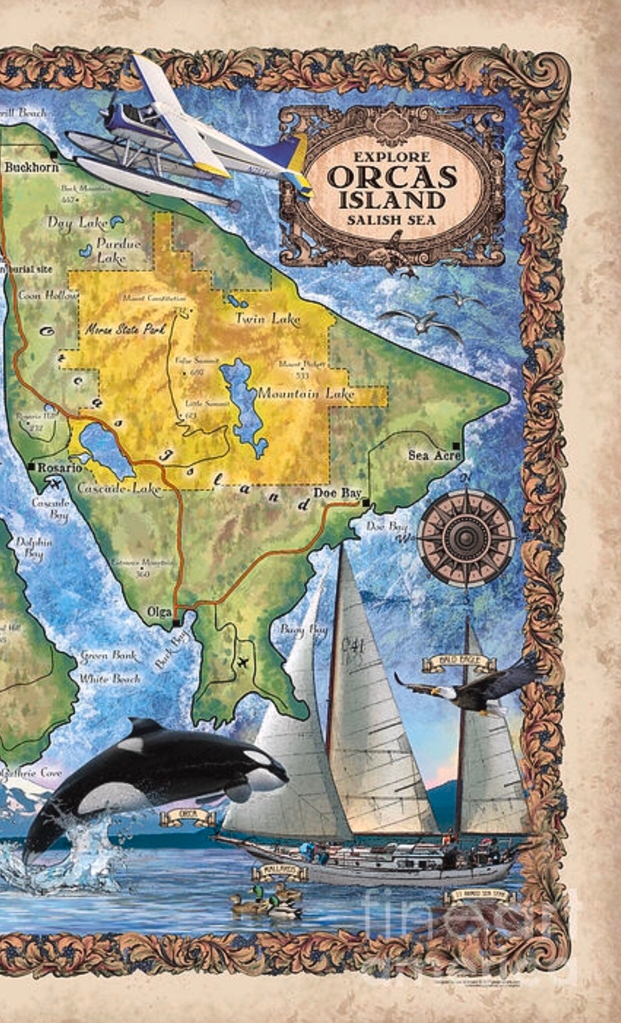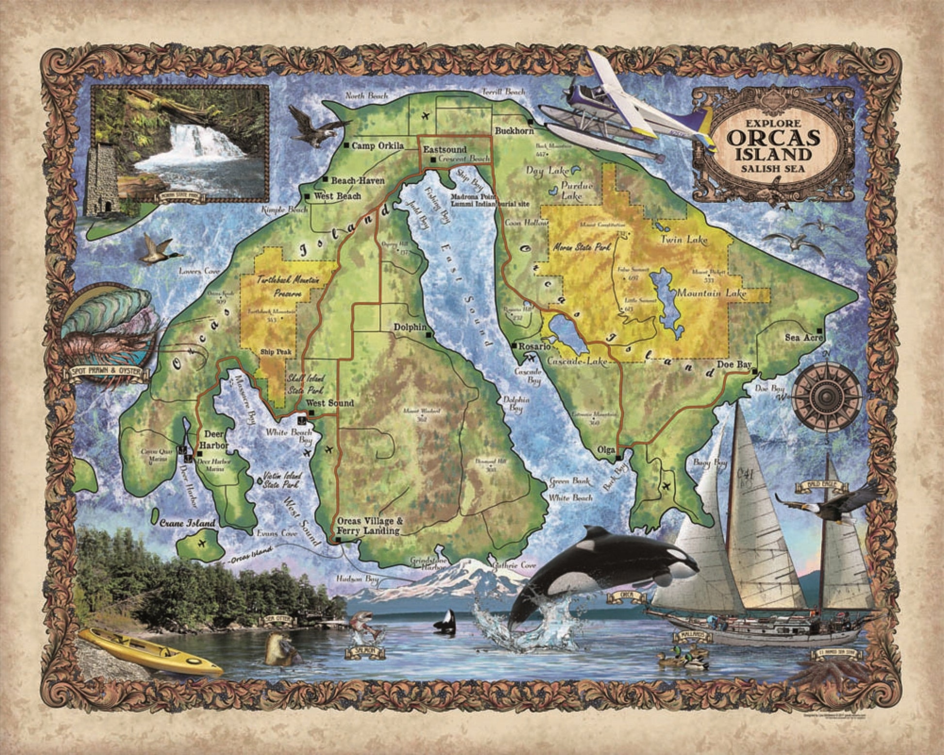 Located in the San Juan islands in the Salish sea is an exquisitely researched and painted vintage style map. Orcas Island is uniquely shaped, and depending on whom you ask, it resembles a pair of saddlebags or a horse-shoe. It is a majestic blend of breathtaking shoreline, gin-blue lakes, towering mountain peak, hilly countryside, dense forest, and charming hamlets and villages. Referred to by locals as the "Gem of the San Juans," the 57-square-mile island-dotted sea is located in the San Juan Islands of Washington State and is a display of pristine natural beauty. This quiet and relaxed piece of paradise is a gem because of great locations like Orcas Village, West Sound, Deer Harbor, Eastsound, Olga and Doe Bay. The name Orcas is derived from Horcasitas, the shortened form of the name Juan Vicente de Güemes Pacheco de Padilla y Horcasitas, segundo conde de Revillagigedo), Viceroy of New Spain, 1789-1794. Horcasitas commissioned an exploration expedition of the Pacific Northwest, including a portion of the San Juan Islands in 1791, led by Francisco de Eliza.