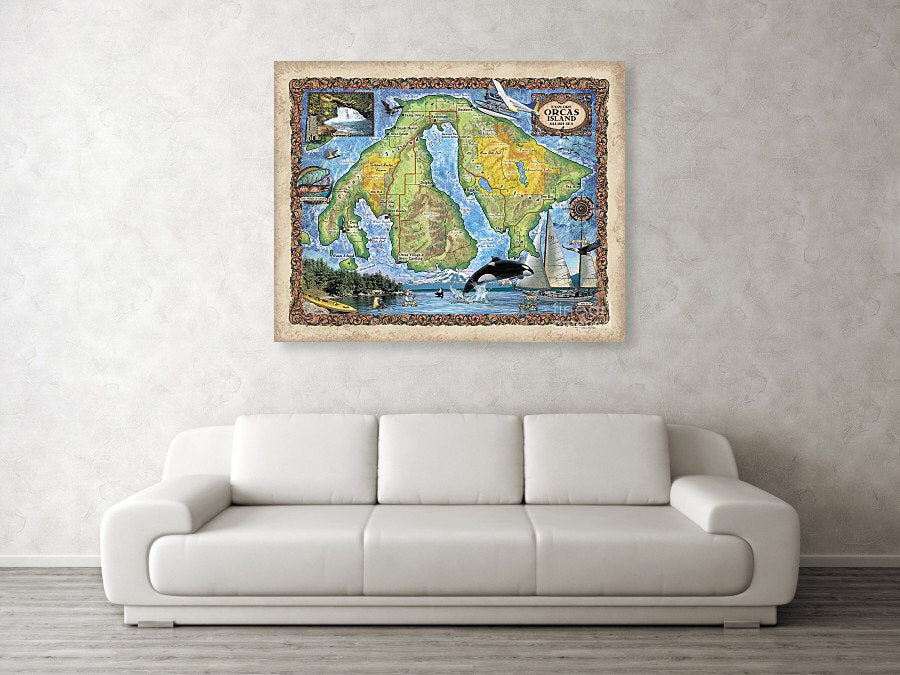 This lovely map of ORCAS ISLAND Puget Sound Washington map are great Seattle gifts of the san juan islands featuring Orcas Island coastal art, orcas art.