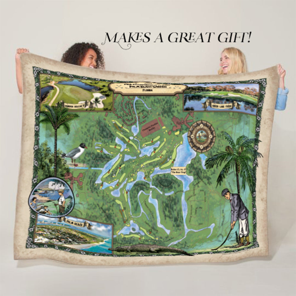 Palm Beach Gardens Florida Map- Sherpa blanket, silky fleece blanket and polar fleece blankets perfect for Mom gifts, Dad gifts, children gifts, and travel gifts. Ideal lake house decor, cabin decor, tropical décor for guest blankets, living room blankets, and anywhere you want to add a beautiful map blanket of your favorite place.