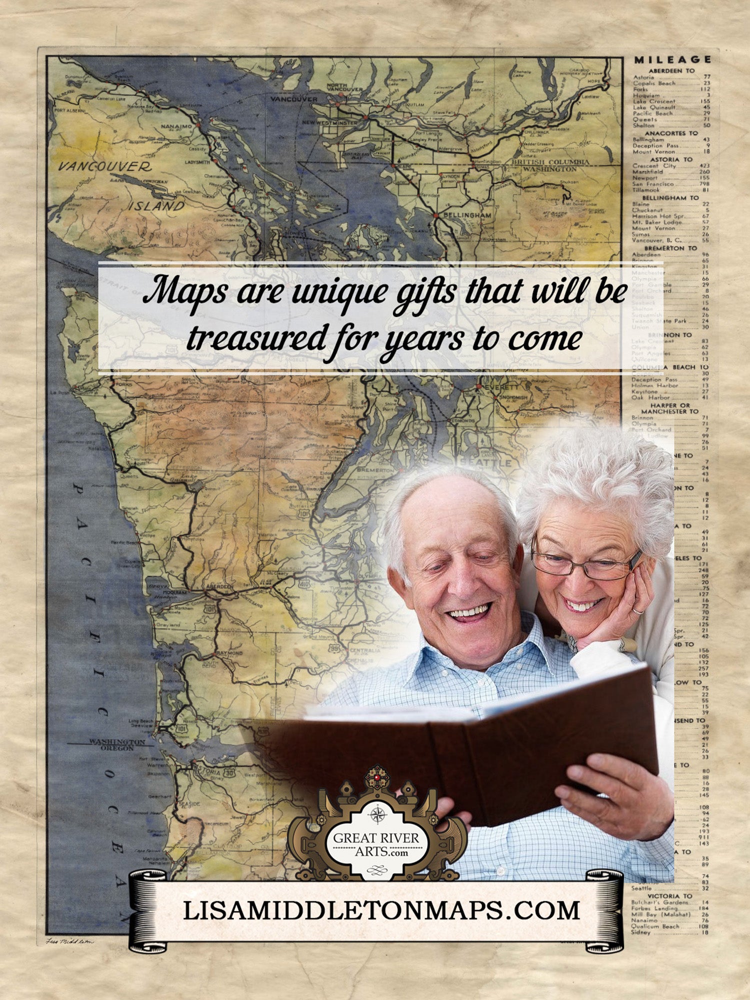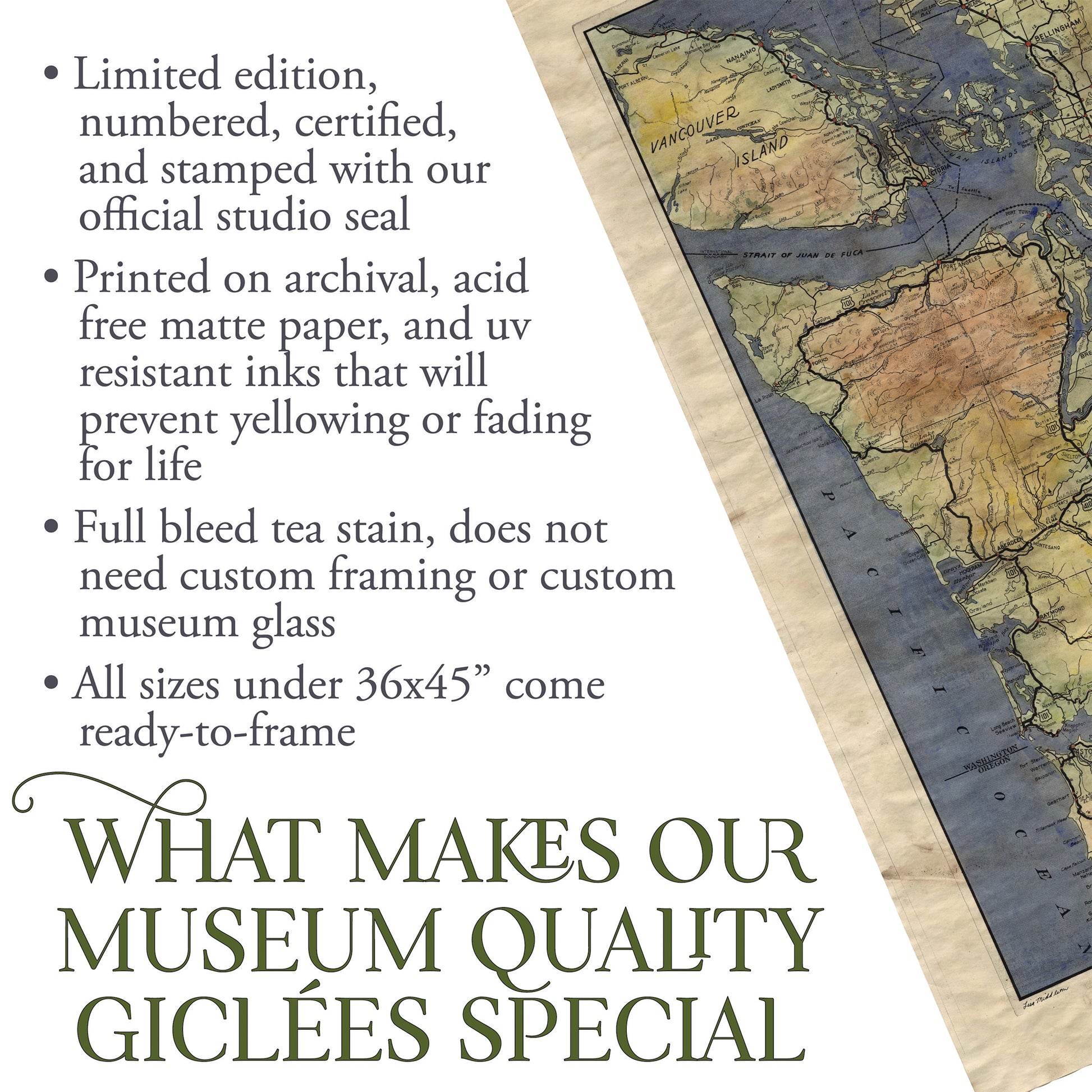 Western Washington 1936 map art print featuring the old roads of western Washington including Olympic Peninsula, Port Townsend, Sequim, Olympia, Seattle, Tacoma and so much more.