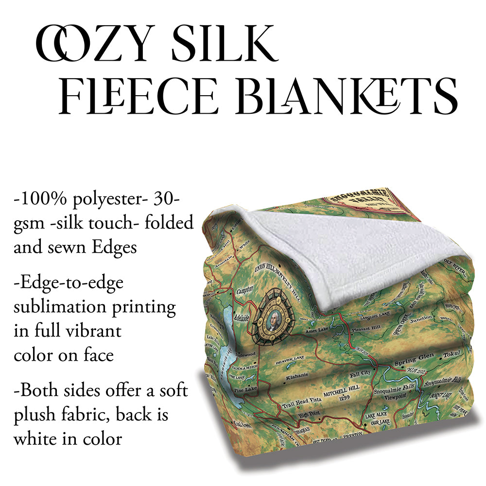 Snoqualmie Valley Washington Map - Sherpa blanket, silky fleece blanket and polar fleece blankets perfect for Mom gifts, Dad gifts, children gifts, and travel gifts. Ideal lake house decor, cabin decor, tropical décor for guest blankets, living room blankets, and anywhere you want to add a beautiful map blanket of your favorite place.
