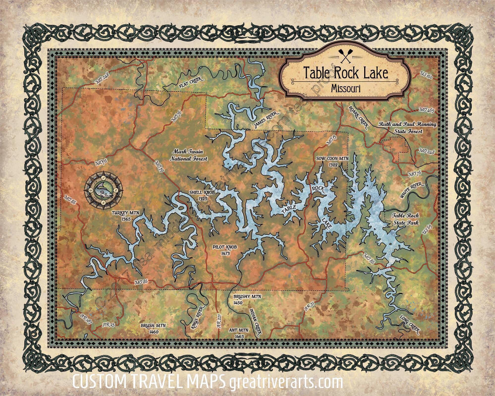 Located in southwestern Missouri’s breathtaking Ozark Mountains, Table Rock Lake is situated near the town of Branson, and covers between 43 and 52 thousand acres (depending on water level), with roughly 800 miles of beautiful shoreline. This manmade lake was constructed in August of 1958 by the U.S. Army Corps of Engineers, that built the Table Rock Dam across the White River. Surrounded by acres of the Mark Twain National Forest, this lake made it possible for hydro-electric power to be distributed to the Ozarks in June of 1959. It is said that the lake’s name has its origin in the original dam site, a large, flat rock formation, which survives today as the scenic overlook on Highway 165.
