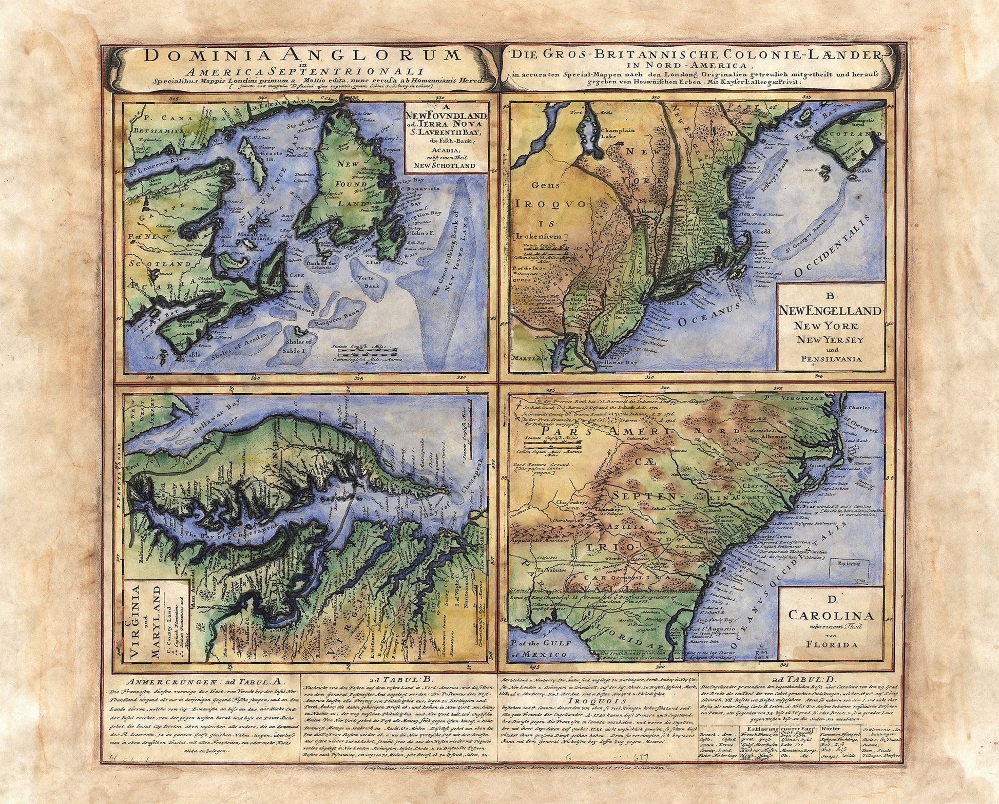 This map shows a good portion of the North American east coast, including Newfoundland and Nova Scotia. The map is broken up into four different quadrants, according to region. It features incredible detail of both offshore and inland features. If you look closely, you will see that special attention was given to the Shoals area. Also, notice the east-west division of the Jerseys. This was drawn according to the original charters established for each province. Hand colored and beautifully drawn, with clear identifiable boundaries, this map looks as if it were an effort to show the might and power of Britain's reach. However, it is a bit more than that. It was an attempt to show not only how far reaching the British had come with their exploration, but also their intricate knowledge of the area and its resources as they pertained to commerce, trade, and navigation.