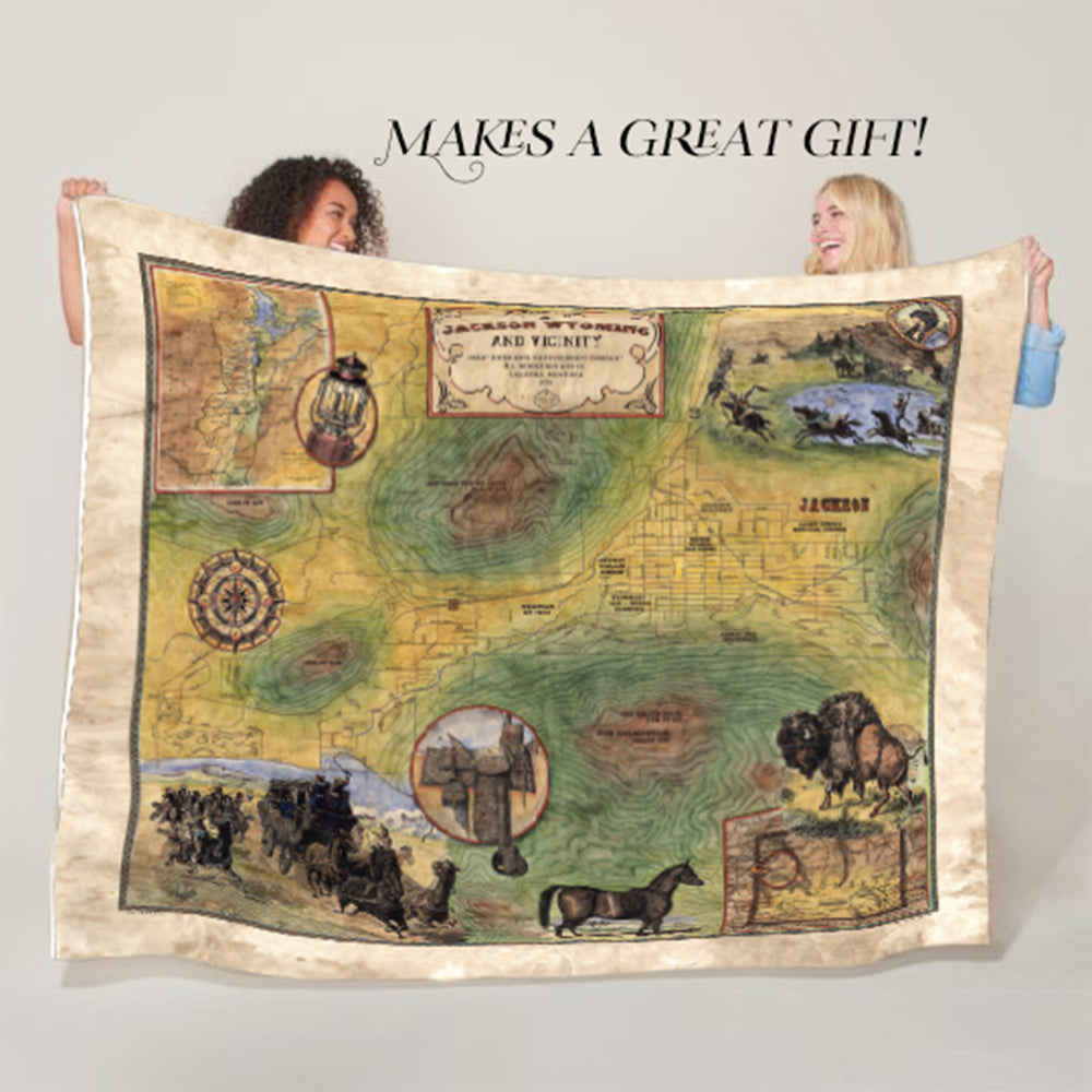 Vintage Custom Map Wyoming Jackson Hole Map - Sherpa blanket, silky fleece blanket and polar fleece blankets perfect for Mom gifts, Dad gifts, children gifts, and travel gifts. Ideal lake house decor, cabin decor, tropical décor for guest blankets, living room blankets, and anywhere you want to add a beautiful map blanket of your favorite place.