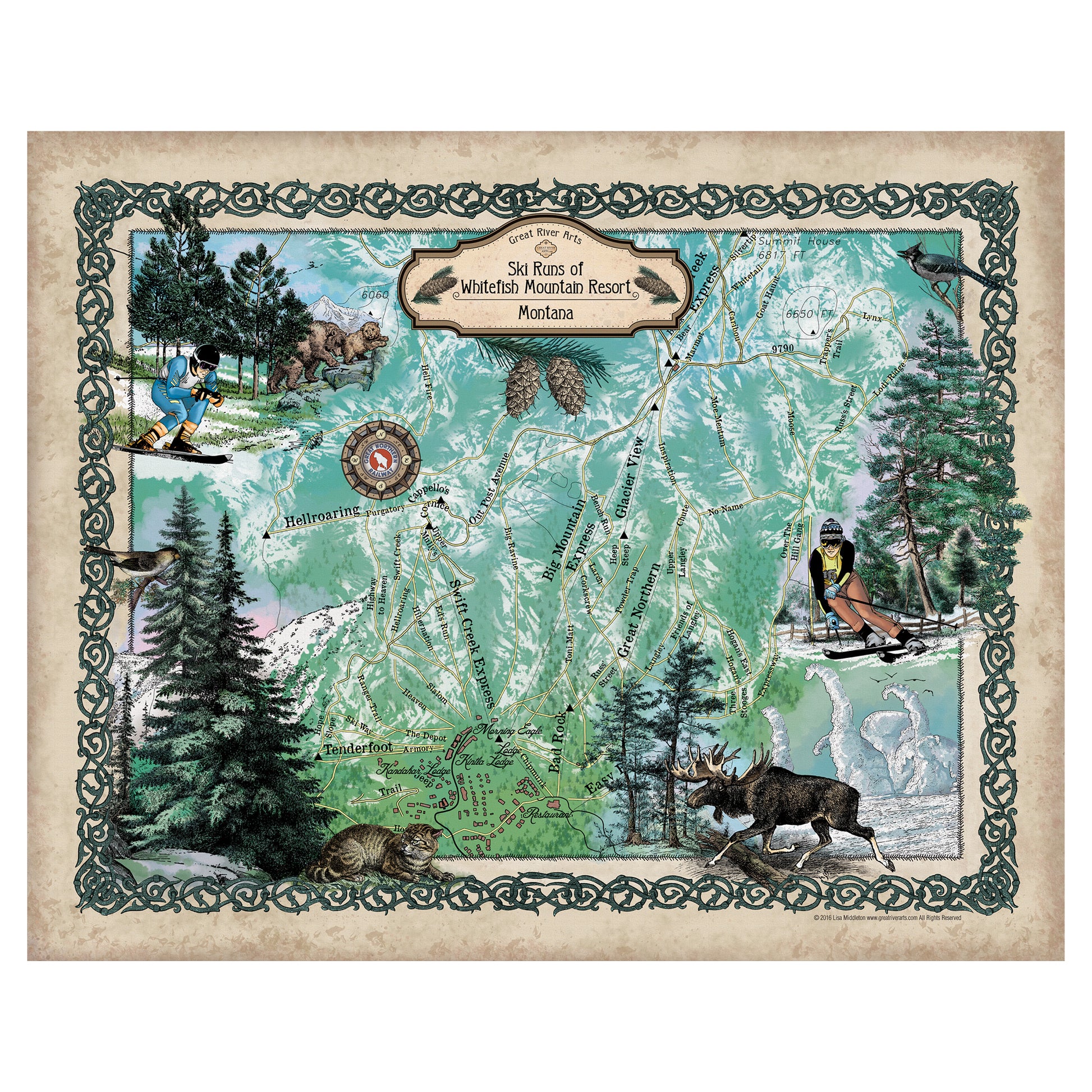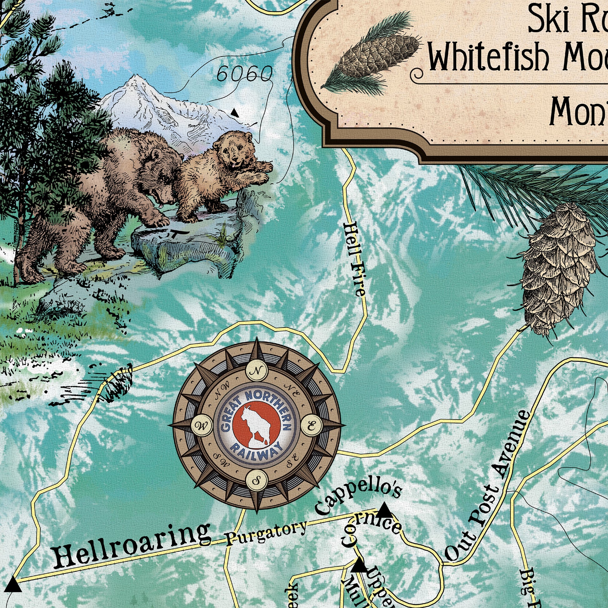 whitefish, whitefish montana, big mountain, montana map, montana ski map, skier gift, skier wall art, skier art, winter artwork, cabin decor
