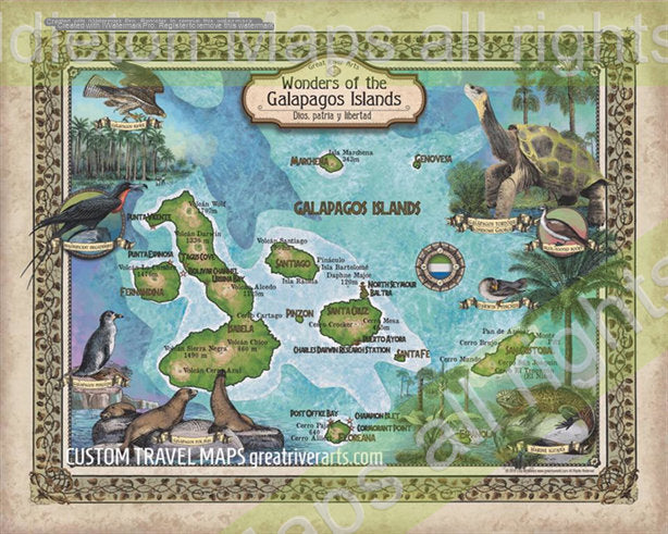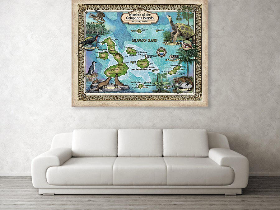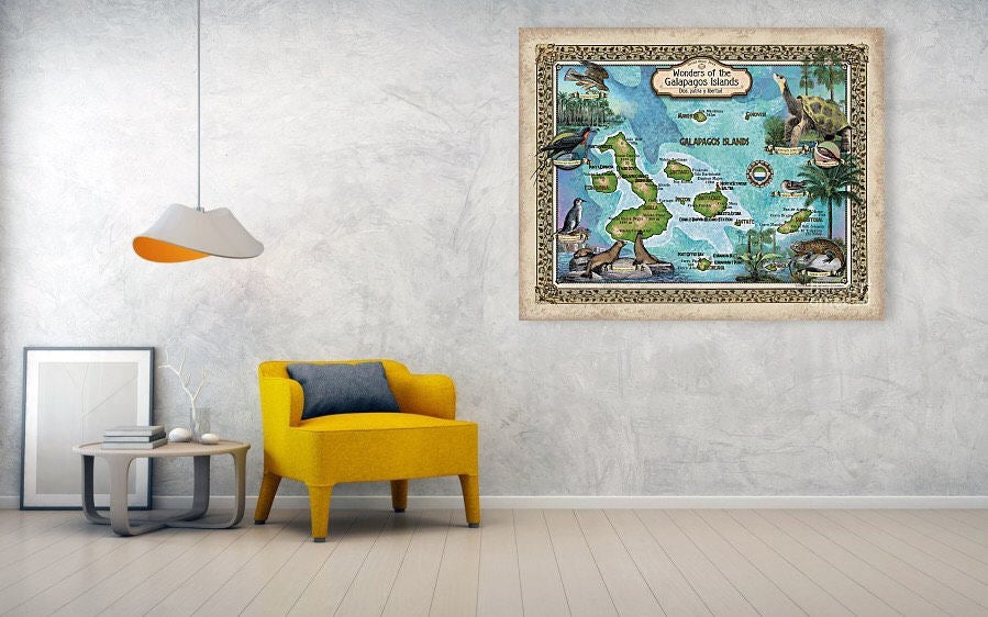 Relax and bask in the island magic of the Galapagos; the perfect gift for world travel! Featuring a Galapagos Tortoise, boasting enchanting colors and incredible and accurate map detail, this map of the Galapagos Islands is the perfect addition to any beach house. Sail away into a sea of blue serenity with this gorgeous wall art.